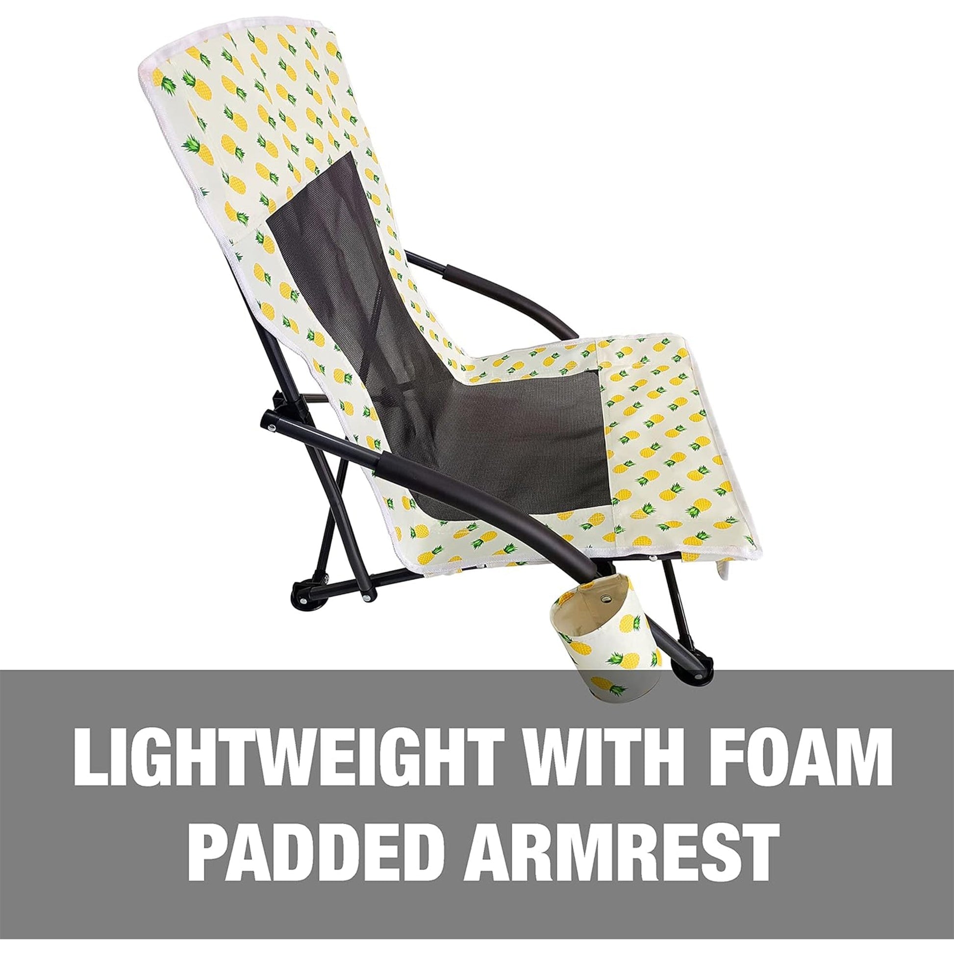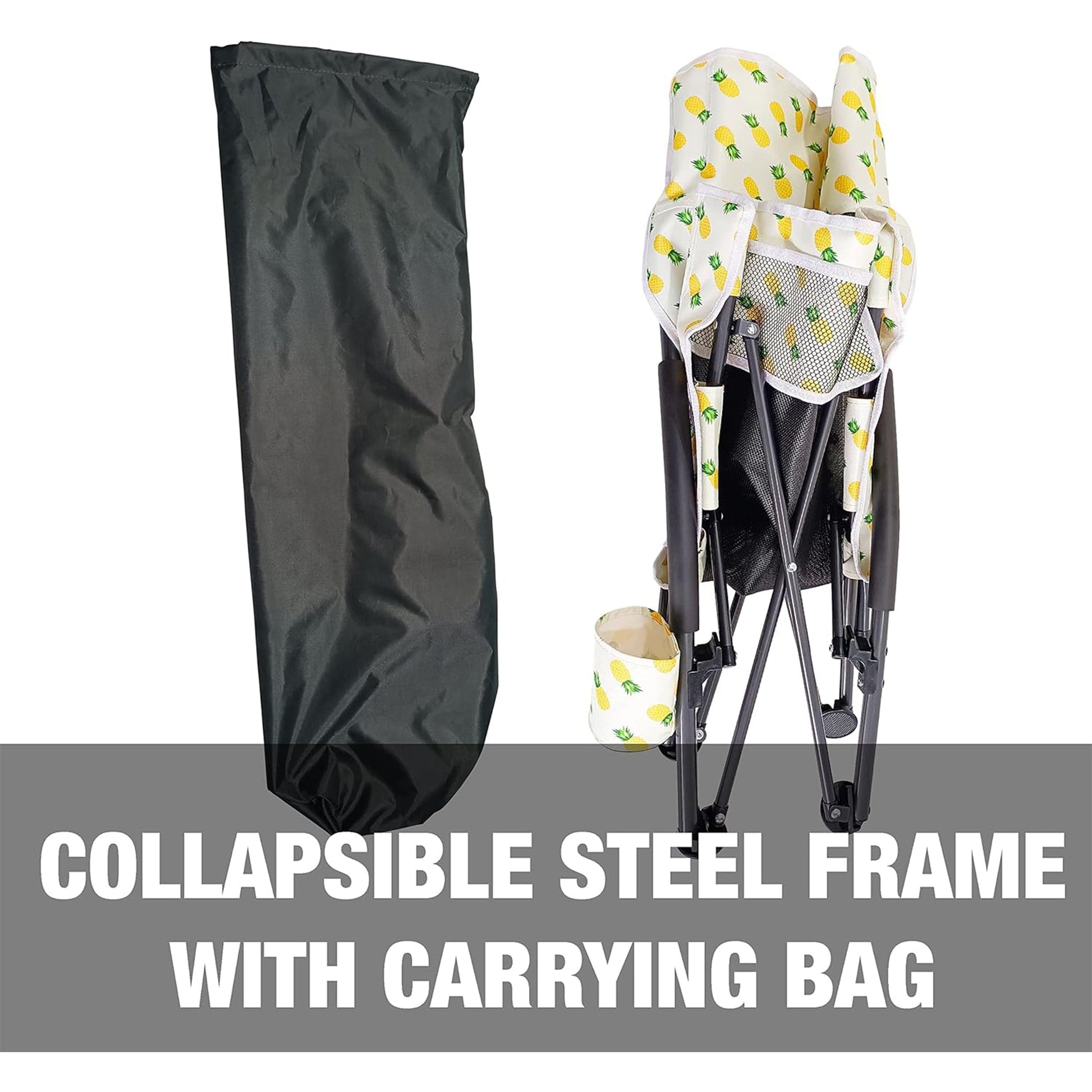 Designed with convenience in mind, the chair easily folds down to a compact 33” x 6” x 5” size, fitting neatly into its included storage bag with a carry strap for effortless transport. Foam-padded armrests add a touch of luxury, while the integrated cup holder and front storage pocket keep your essentials close at hand. Whether you’re sipping a cold drink, enjoying a snack, or storing small items, this chair is equipped for all your needs.