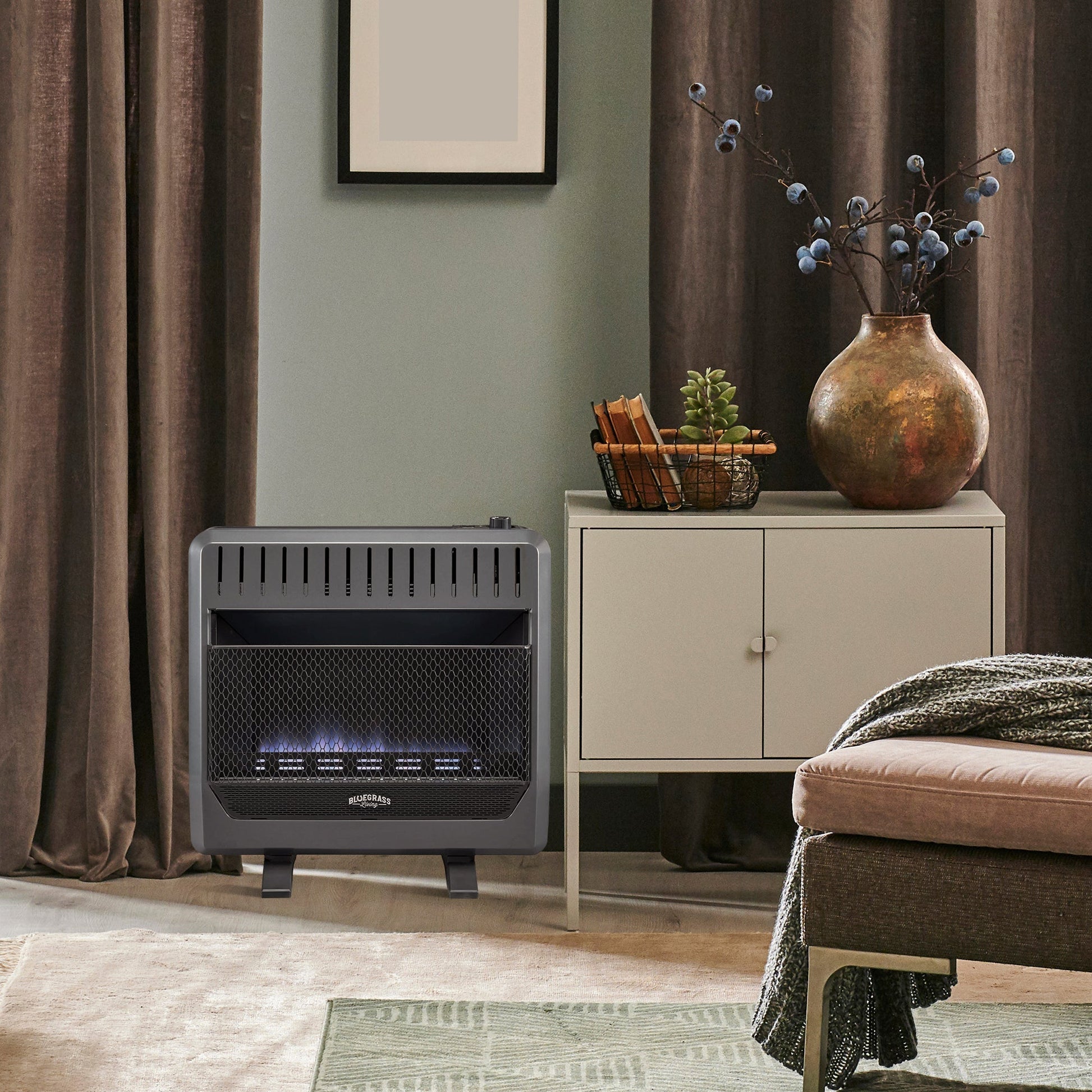 Fueled by liquid propane gas, this heater delivers an impressive 30,000 maximum BTU, warming spaces up to 1,400 square feet. The internal thermostat and built-in blower circulate warm air and ensure temperatures stay regulated. This blue flame gas space heater burns cleanly and efficiently, putting safety first and creating a cozy and comfortable atmosphere by warming the air in your space just like central heating. The unit doesn’t require electricity and keeps you warm even when the power goes out.