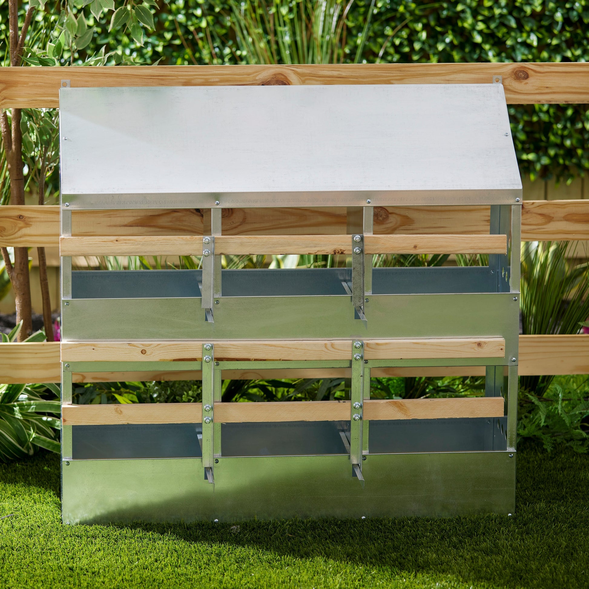 This pack of 3 poultry laying boxes is made from durable galvanized steel with folded edges for safety and a slanted roof to help keep your cluckers safe from the elements. The 6 bays provide room for up to 30 brooding hens and feature side ventilation holes for airflow. Stagger the nests back-to-back to prevent the hens from having full mobility if necessary. The outdoor hen house features double-bolted perches with hinged that allow them to be folded back easily as desired. Assembly and installation are made quick and easy with the included instructions. Setup takes under an hour and only requires a screwdriver and wrench; no rivet gun is necessary.
