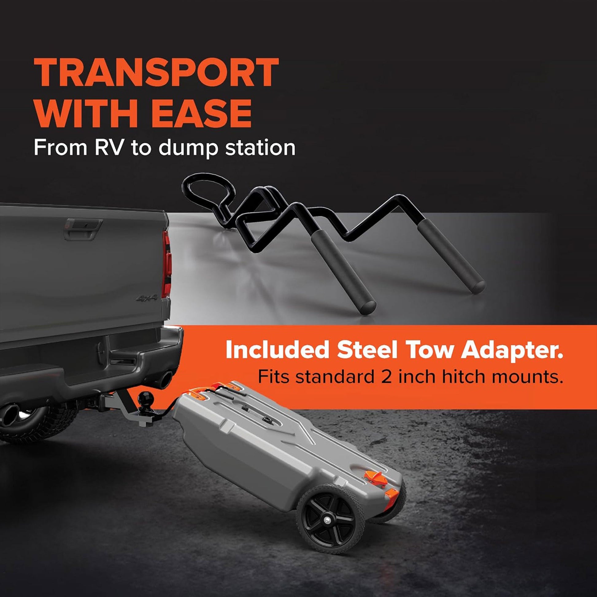 Constructed of durable blow-molded, UV stabilized HDPE that won’t leak or deteriorate in the sun. With zinc-plated hardware, rust and corrosion are prevented. The inside of the tote tank is smooth so that it doesn’t trap odors or debris, and is sloped toward the drain hole, making it easy to empty. The handle is oversized and durable, allowing you to pull or tow the tote tank without worry. The bottom of the tote tank features an integrated ladder hook, allowing you to hang the tank on your RV’s ladder when it is empty, and tie-down grooves to hold it in place with straps. This ready-to-use kit includes everything needed to transport waste from your RV or trailer to a dump station.