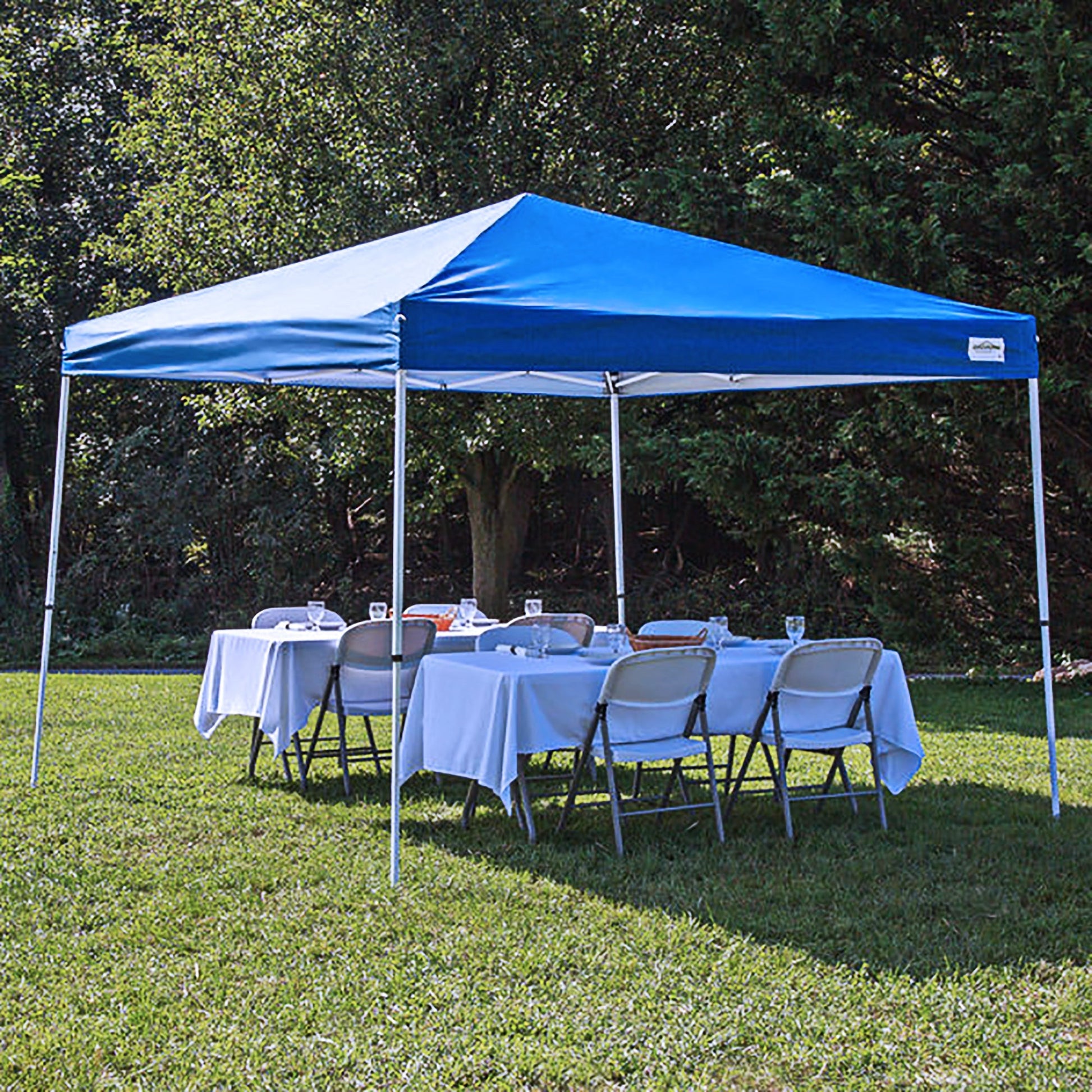 - Fully assembled slant leg pop up canopy with cathedral style, white powder coated steel frame for maximum head room