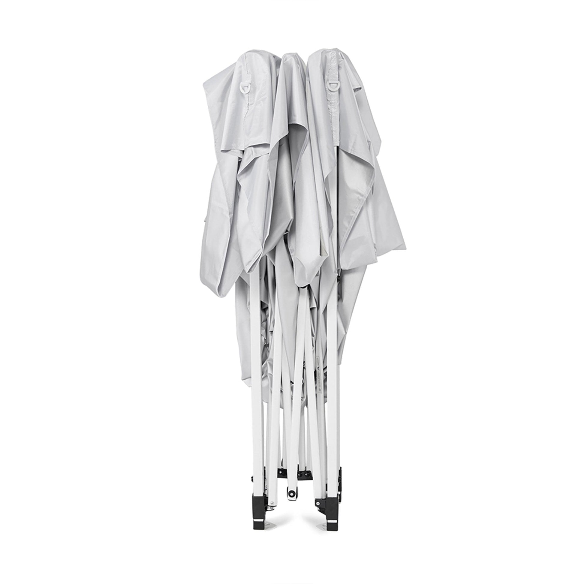 - Fully assembled slant leg pop up canopy with cathedral style, white powder coated steel frame for maximum head room