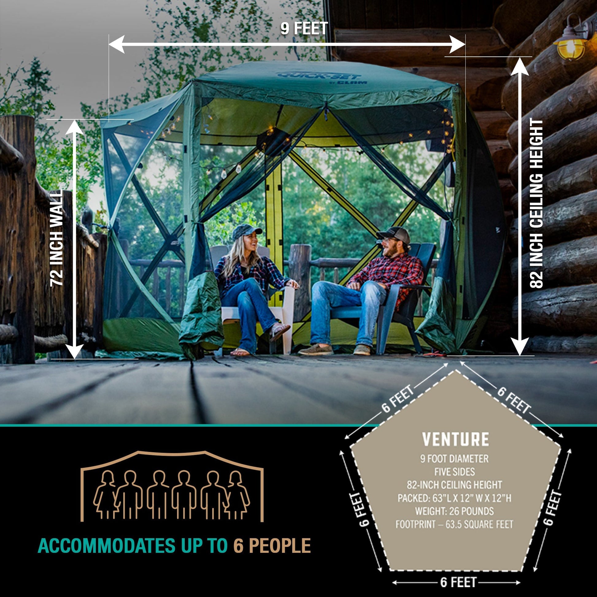 Experience the ultimate outdoor comfort with the CLAM Quick Set Venture Portable Outdoor Gazebo Canopy Shelter. Rain or shine, this pop-up canopy ensures you enjoy the outdoors without worrying about the elements. Accommodating up to 6 people, its 5-sided design provides ample space for various outdoor activities like camping, picnics, or sporting events. Equipped with a no-see-um mesh screen and extra-wide skirt, it keeps bugs at bay, allowing you to relax in peace. The taped roof panel offers superior water resistance, ensuring you stay dry even in unexpected weather conditions.