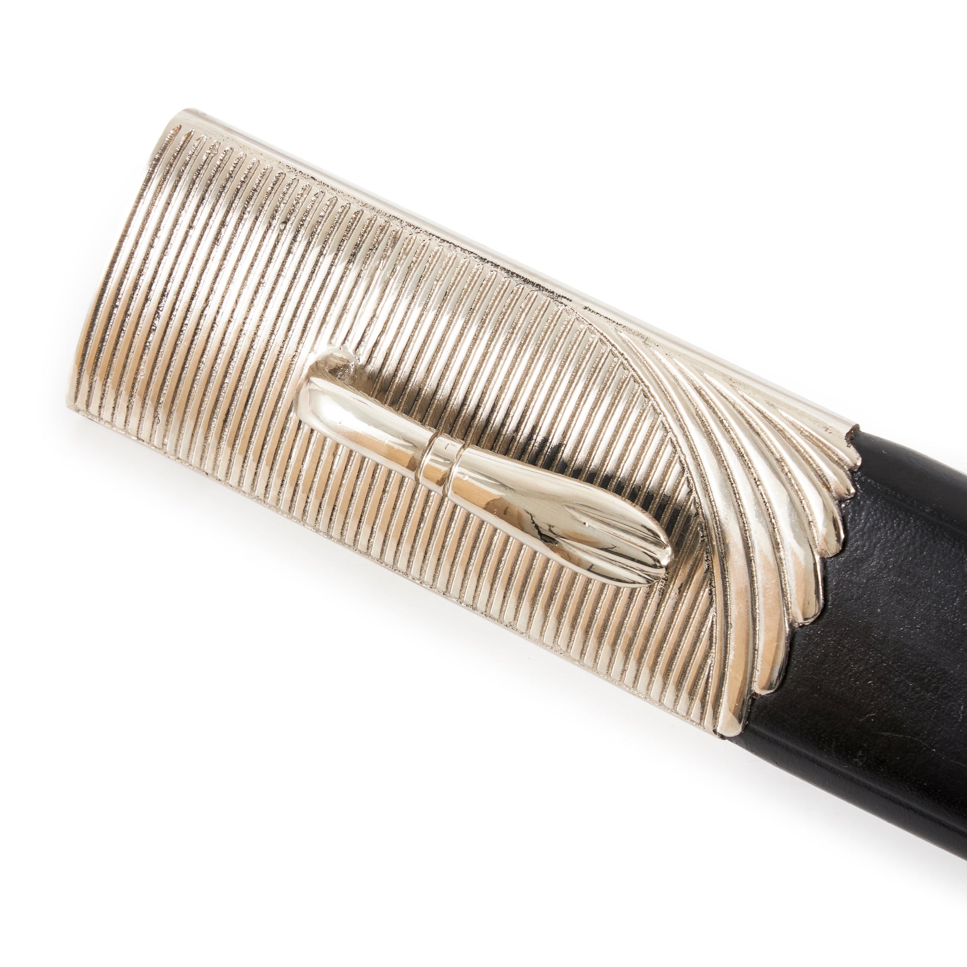 The included scabbard’s style harmonizes engagingly with the sword’s design. It’s made from heavy, black leather and capped at each end with an embossed nickel-silver throat and chape.