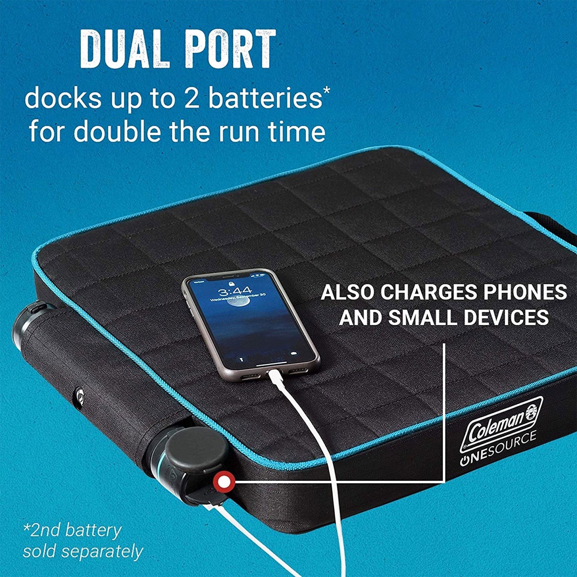 Whether you're placing this cushion on a bleacher seat or on a Coleman camping chair, you'll be able to feel a true, cozy difference in comfort and warmth. Power your heated chair pad using the lithium-ion rechargeable battery, an interchangeable battery that works with all Coleman OneSource products, and eliminate the need for multiple power sources by charging your devices through the USB port.