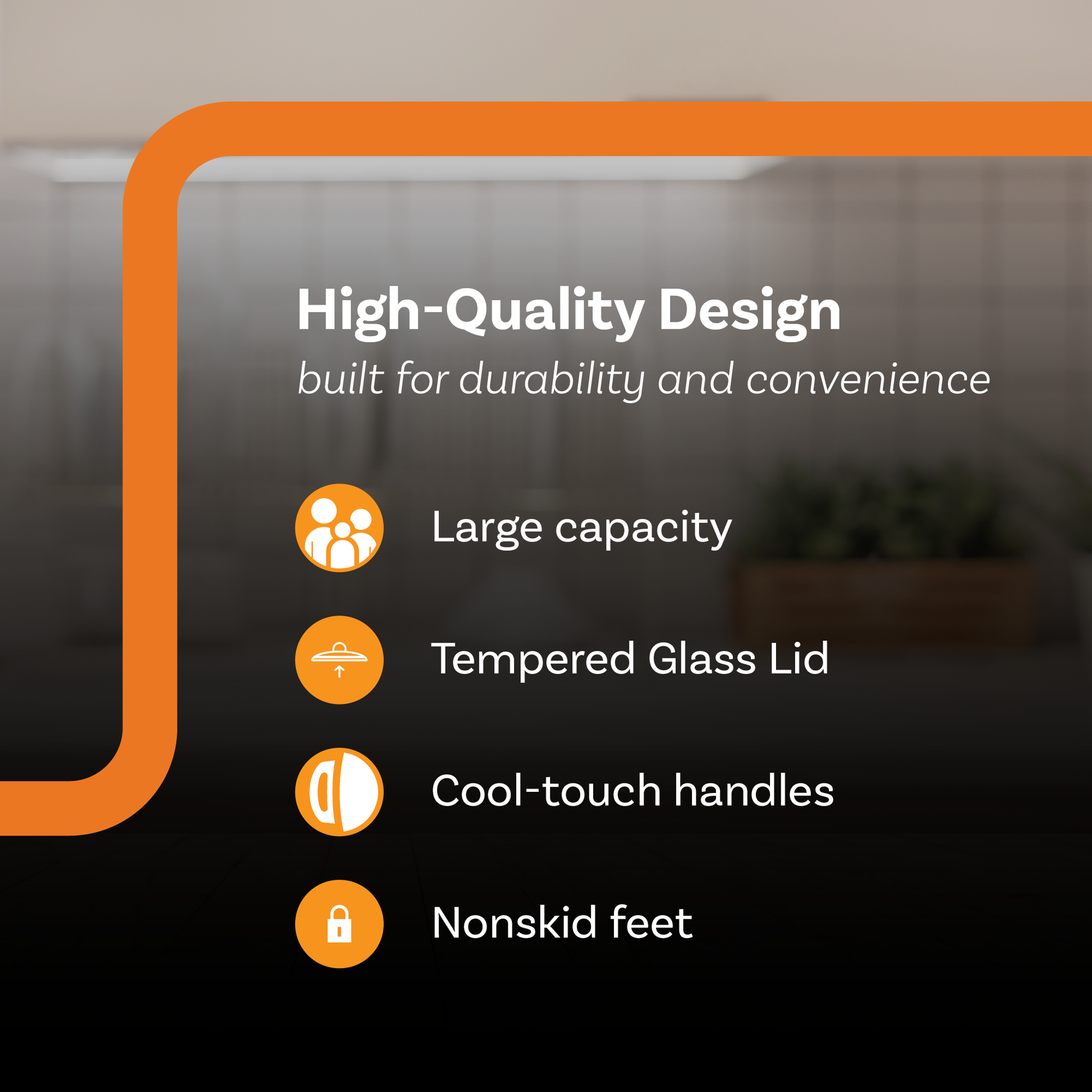 This slow cooker features a stainless-steel exterior, a removable ceramic pot, and a tempered glass lid. The lid and pot are dishwasher safe, and the exterior is easy to wipe down for simple cleanup. The pot also includes cool-touch handles and nonskid feet for stability and safety so you can cook and serve with ease.