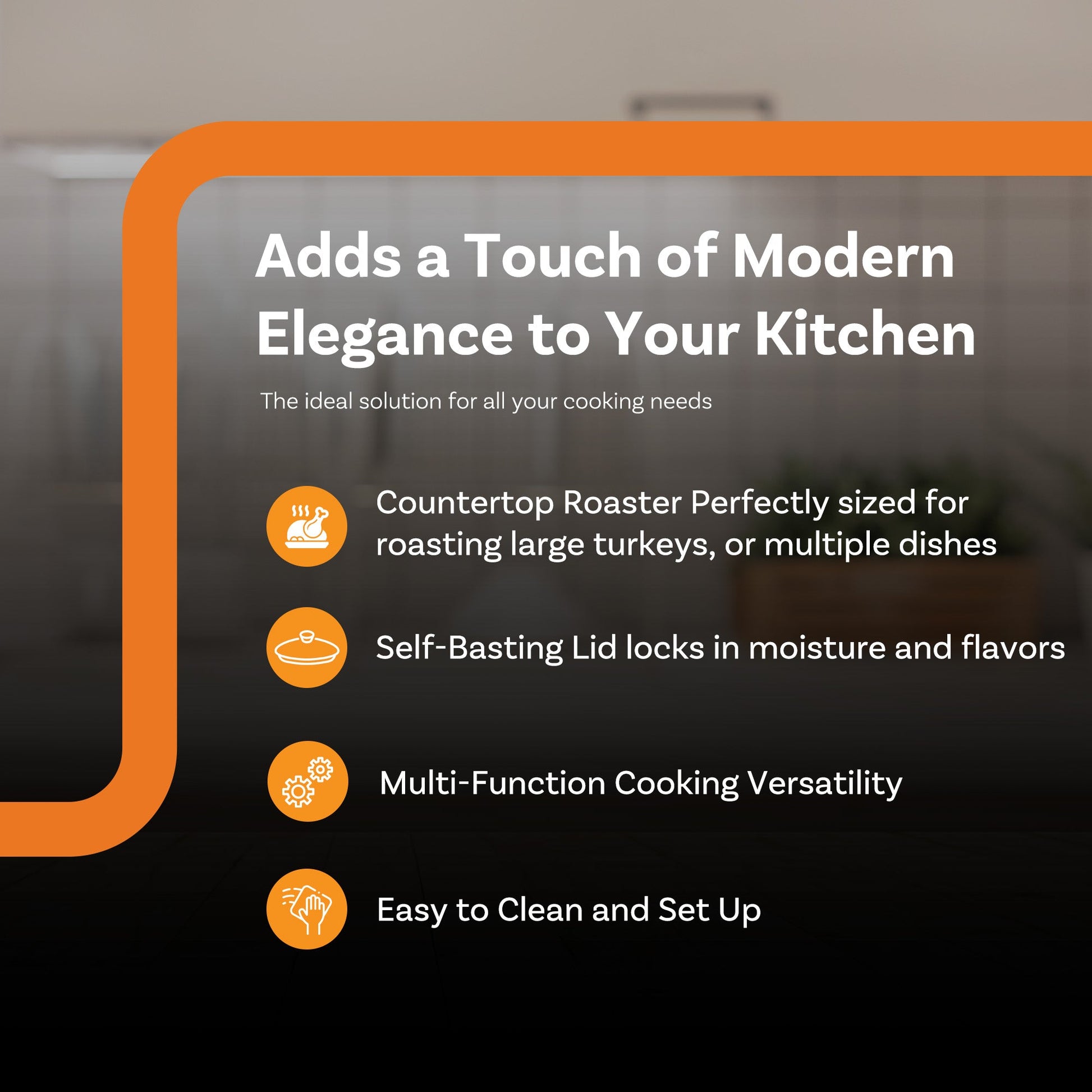 - Crafted with a sleek stainless-steel exterior, this roaster oven is stylish, durable, and complements any kitchen countertop while resisting wear