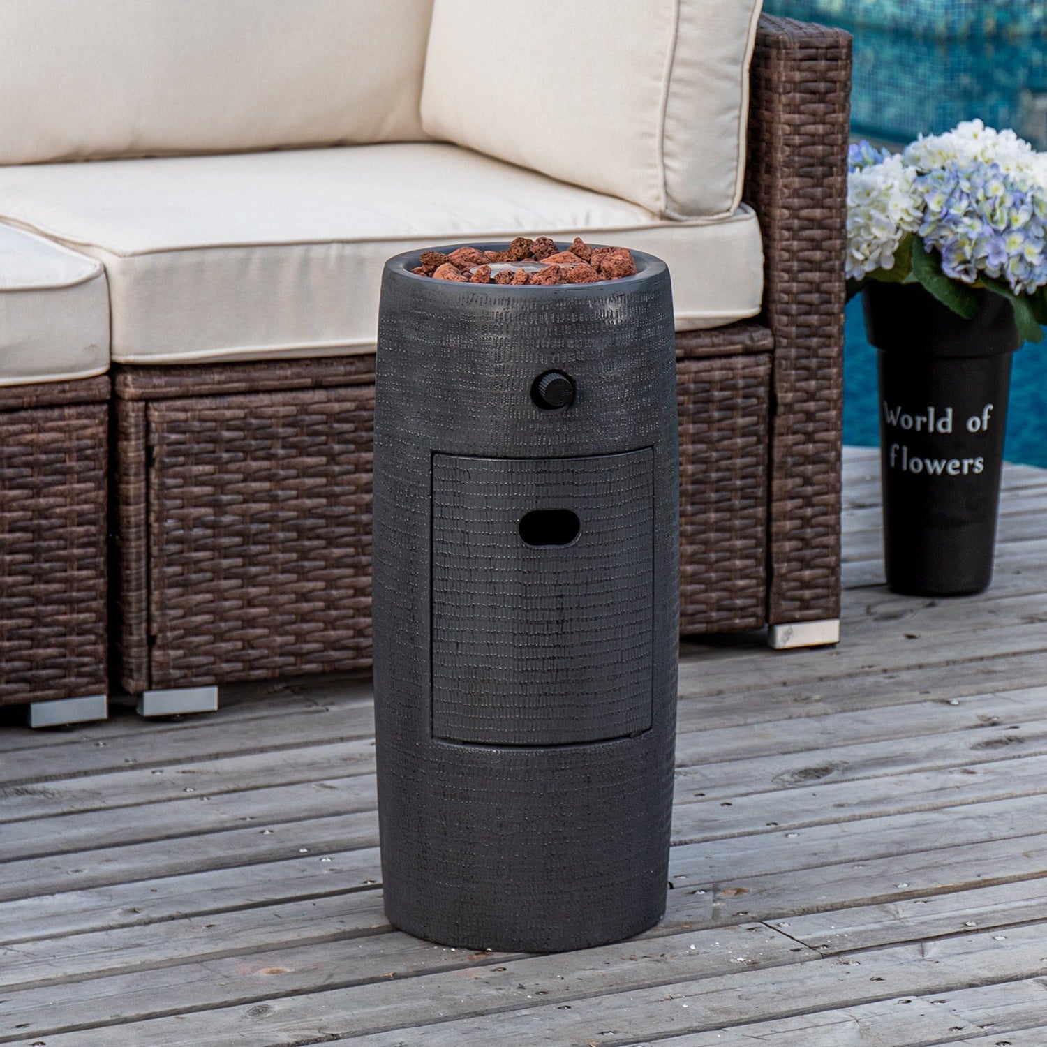 Enhance your outdoor space with the COSIEST propane fire pit. This compact 11" square table features a rustic concrete-style base, clean-burning propane flames (tank not included), and lava rocks for even heat. Perfect for decks, its 22" height provides cozy warmth without smoke. Includes waterproof cover and 1-year warranty.