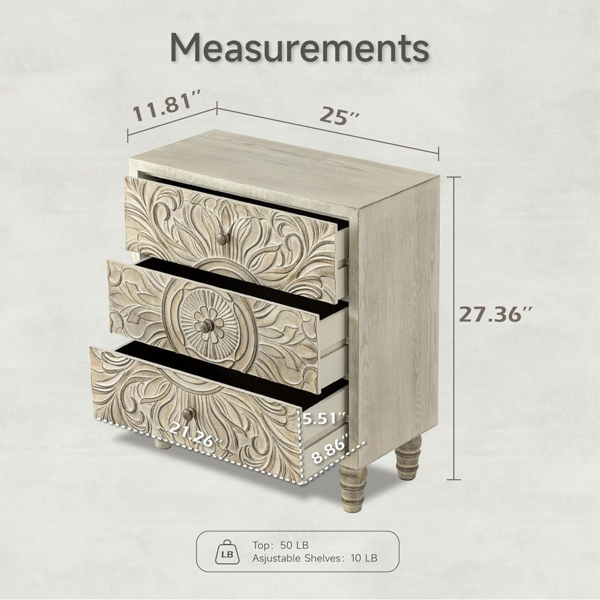 COZAYH Farmhouse 3 Drawer Home Bedroom Dresser with Embossed Flower Motif Front