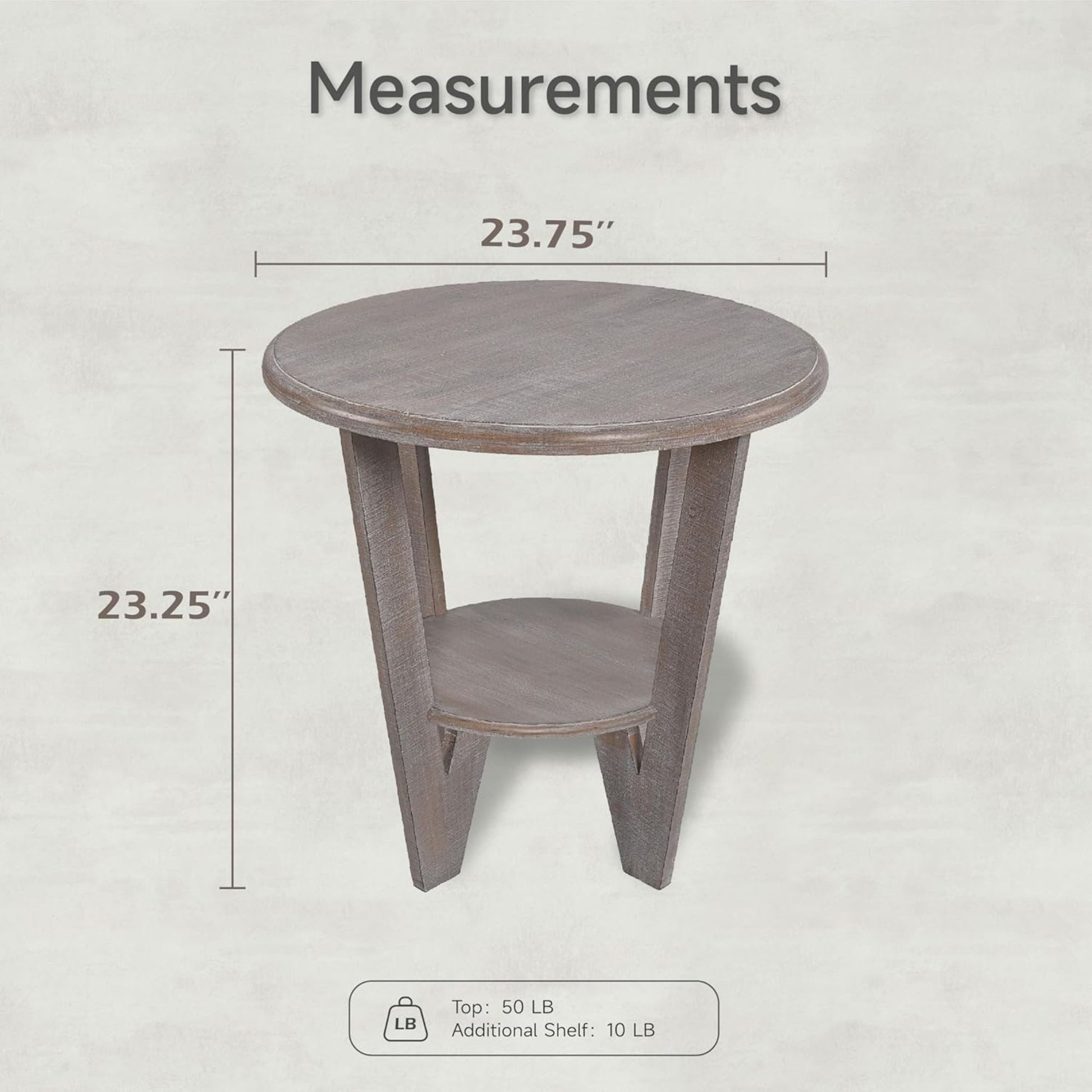 The table features a distinctive round silhouette, complete with a smooth, thick-edged top that rests gracefully on four V-shaped legs, all finished in a soft, vintage grey veneer. This artful table with clean lines delivers standout visual appeal and rustic charm. Use the tabletop to display flower vases, candles, picture frames, or a decorative lamp, while the lower round shelf is perfect for small baskets, books, or living room essentials.