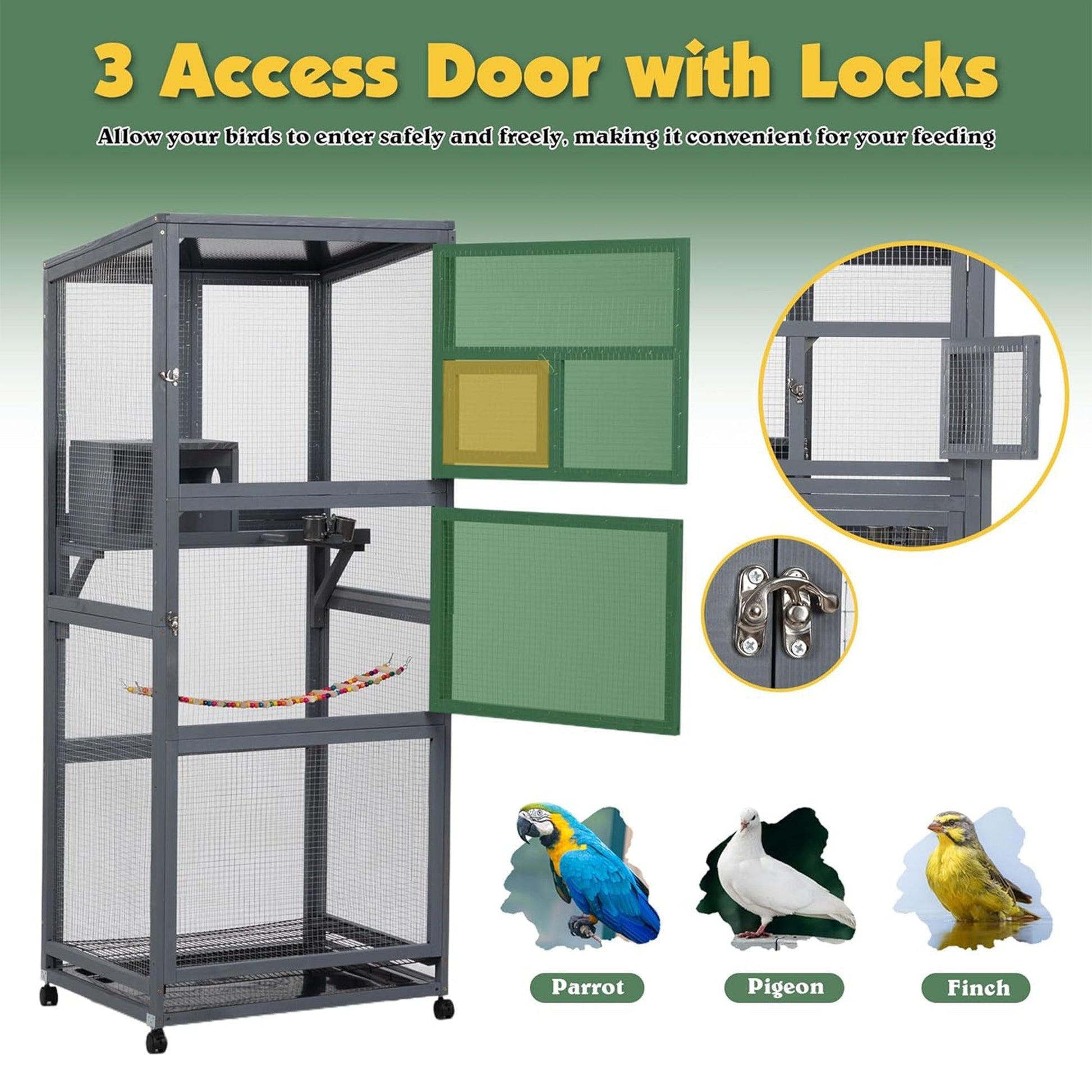 Mobility is key with this versatile bird cage. Featuring 4 sturdy wheels, 2 of which have brakes, you can easily move the cage indoors or outdoors, allowing your feathered friends to bask in the sun or explore the great outdoors. Three secure doors with locks provide easy and secure access for feeding and caring for your birds.