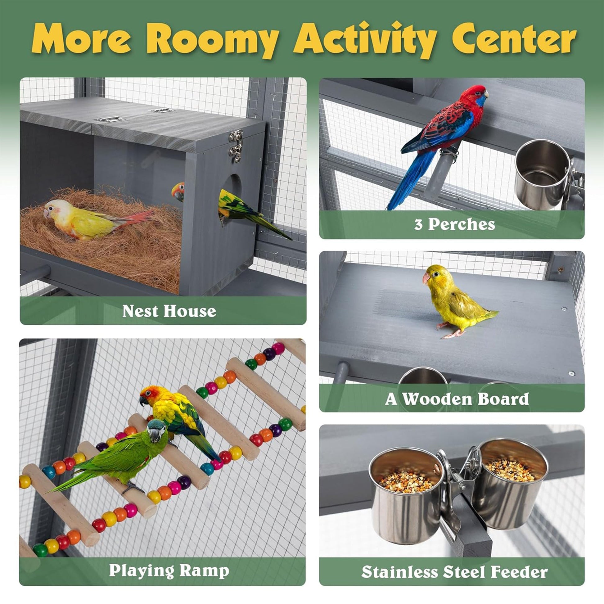 Equipped with a large nest house, a pull-out tray, and a convenient feeder, this bird cage is a true avian playground. Your birds can indulge in their natural behaviors, hopping, perching, and nesting, while you enjoy the convenience of easy cleaning and maintenance. The removable wire-netting above the pull-out tray keeps the cage clean, and the wire mesh effectively prevents any escape attempts.