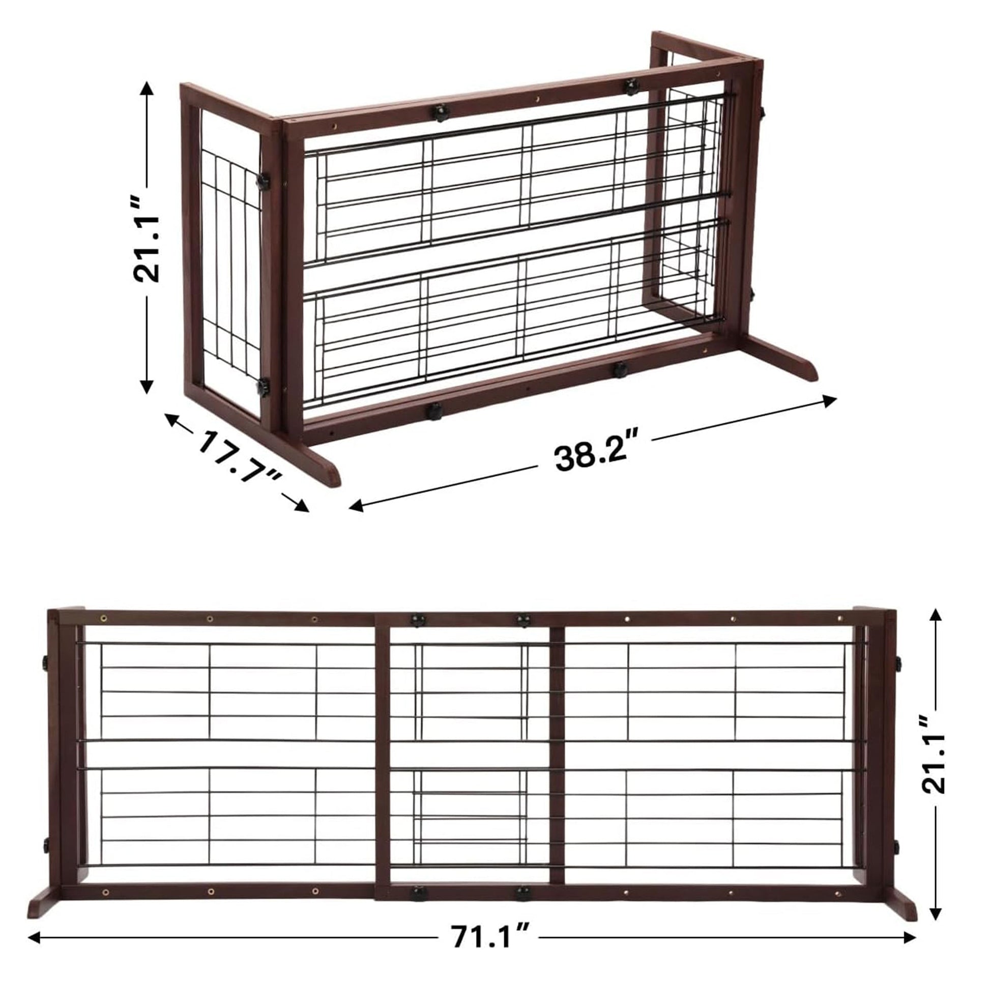 Designed for small to medium-sized dogs, this no-drill installation gate offers a secure barrier without damaging walls or door frames. Whether you need an indoor dog gate or a pet safety gate, COZIWOW ensures hassle-free setup and peace of mind. Its adjustable width design spans from 38 to 71 inches, making it versatile enough to fit a variety of spaces, including doorways, staircases, or open floor plans. Crafted with a sturdy wooden frame and reinforced wire mesh, this wide dog gate is built to last while offering a timeless brown finish that complements any home decor. The side panels add stability and prevent tipping, ensuring reliable protection for your pets. Weighing just 11.7 pounds, this lightweight and foldable pet gate is easy to move and reposition, making it ideal for any room in your house. When not in use, it folds down compactly for simple storage. The thoughtful design also includes a convenient walk-through feature, allowing you to step over effortlessly without the need to dismantle the gate, making it perfect for high-traffic areas. Beyond just a barrier, this freestanding gate is a versatile addition to your home. It can double as a playpen or room divider, giving you the flexibility to create designated pet zones while maintaining a clean and organized space. Whether you’re protecting your stairs, sectioning off rooms, or creating a cozy play area, the COZIWOW Dog Gate delivers unmatched functionality and style.