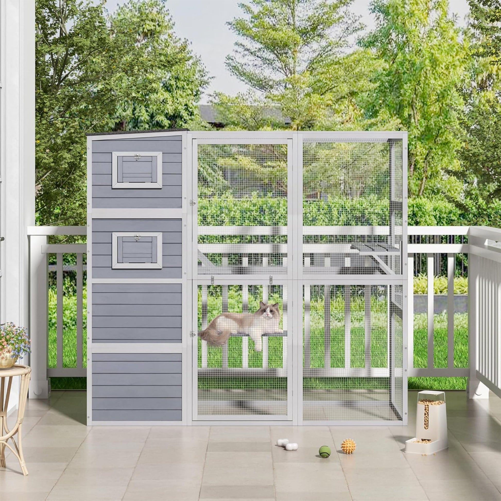 - Spacious 4-tier catio design offers 2 cozy condos and 2 elevated platforms for play and relaxation