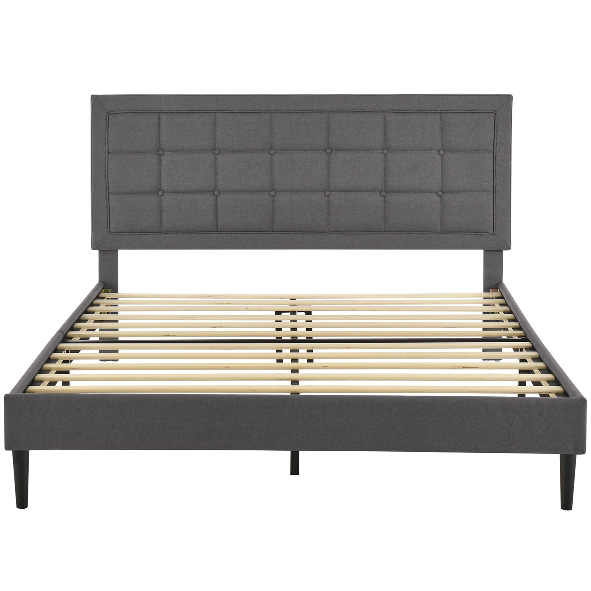 - Headboard bed frame features a rectangular, button-tufted design that adds a touch of elegance to your bedroom; Fabric bed frame is upholstered in soft grey fabric, creating a cozy and inviting atmosphere