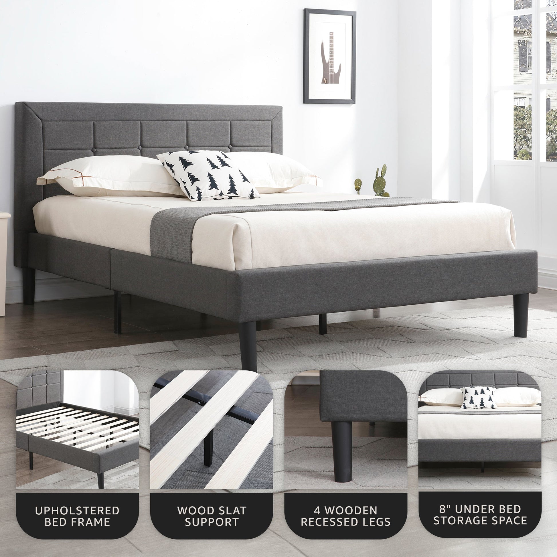 - Upholstered bed frame features a durable wood frame and a button-tufted fabric headboard, adding a modern touch to your bedroom decor; Wood slat support system ensures your mattress stays in place without sagging, offering the ultimate comfort and longevity