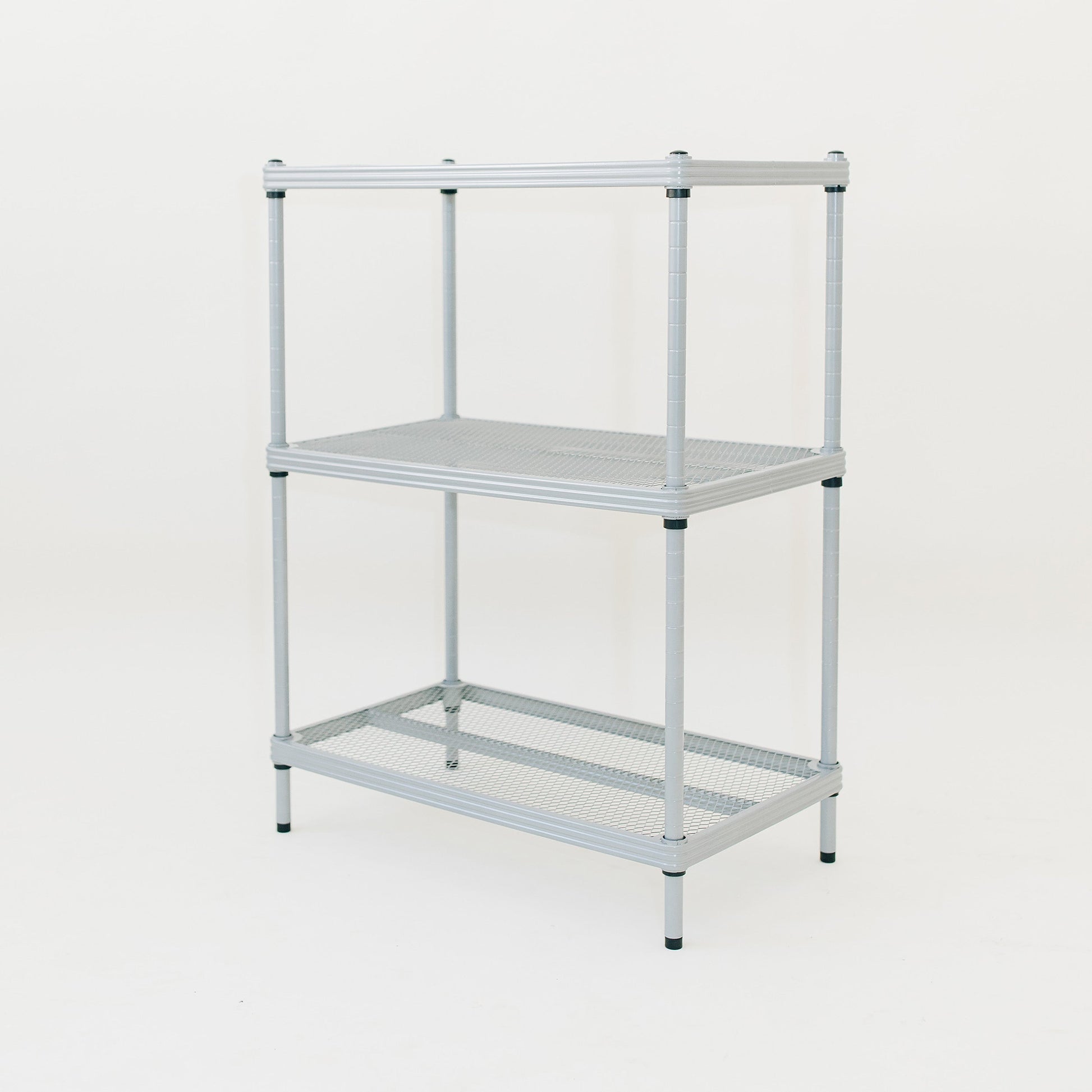 Featuring a heavy-duty steel metal mesh design and epoxy coating, each shelf from this standing shelf unit is capable of holding up to 440 pounds. With the expanded metal mesh shelving, this multipurpose display shelf rack will not let bottles, cans, or other small items fall through. The open design allows to you see your items from any angle, great for easy access. Use this shelving rack as a bookshelf, as a display for your favorite home decor, and even for craft storage.