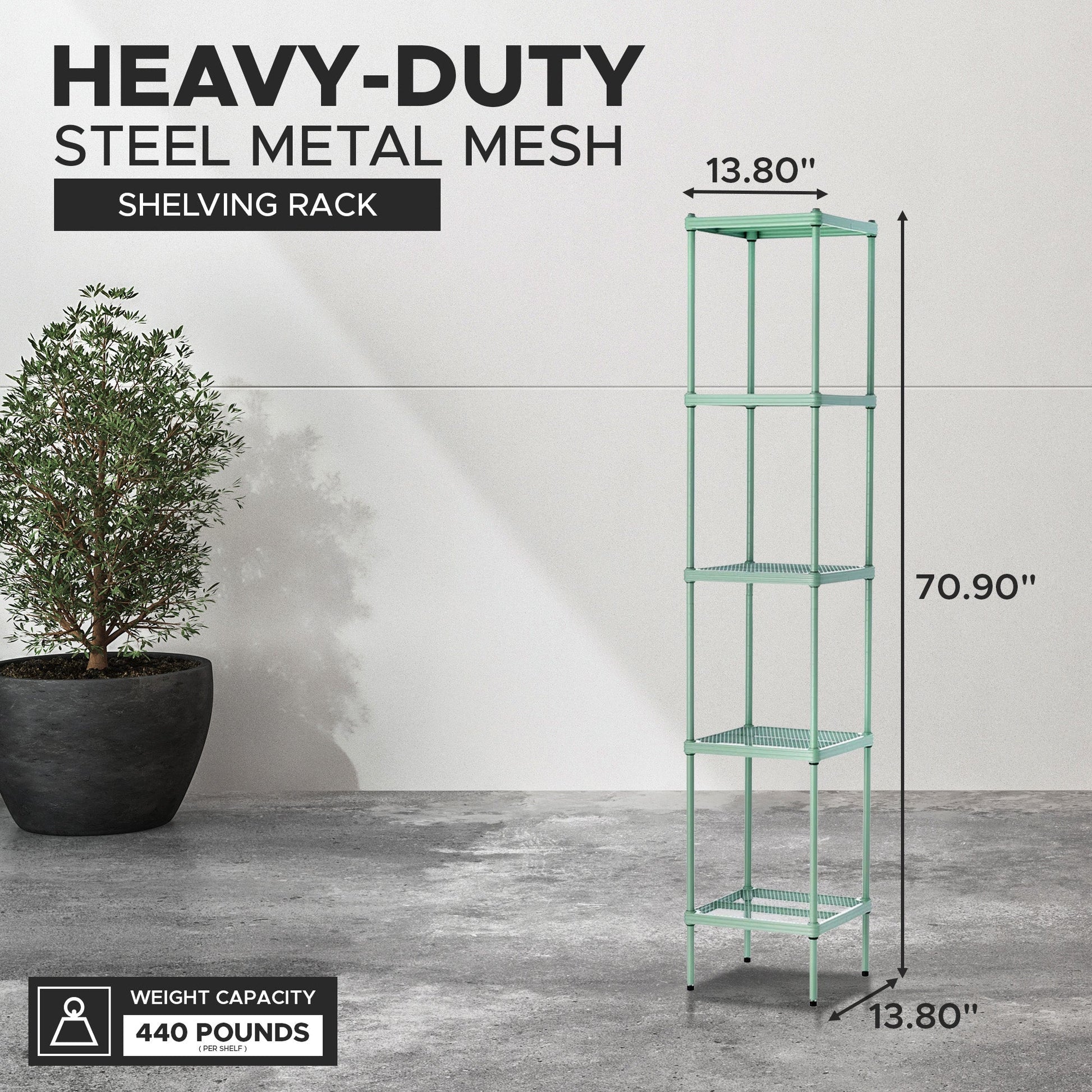 - Heavy-duty stainless steel metal mesh design; Each shelf from this standing shelf unit supports up to 440 pounds