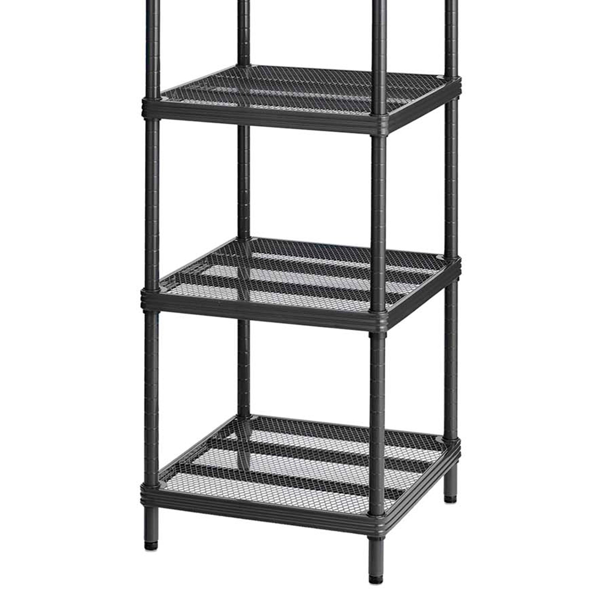 Featuring a heavy-duty steel metal mesh design and epoxy coating, each shelf from this standing shelf unit is capable of holding up to 440 pounds. With the expanded metal mesh shelving, this multipurpose display shelf rack will not let bottles, cans, or other small items fall through. This shelving rack for pantry storage gives you the ability to customize your space as you can add caster wheels (sold separately) giving you your own unique storage freedom.