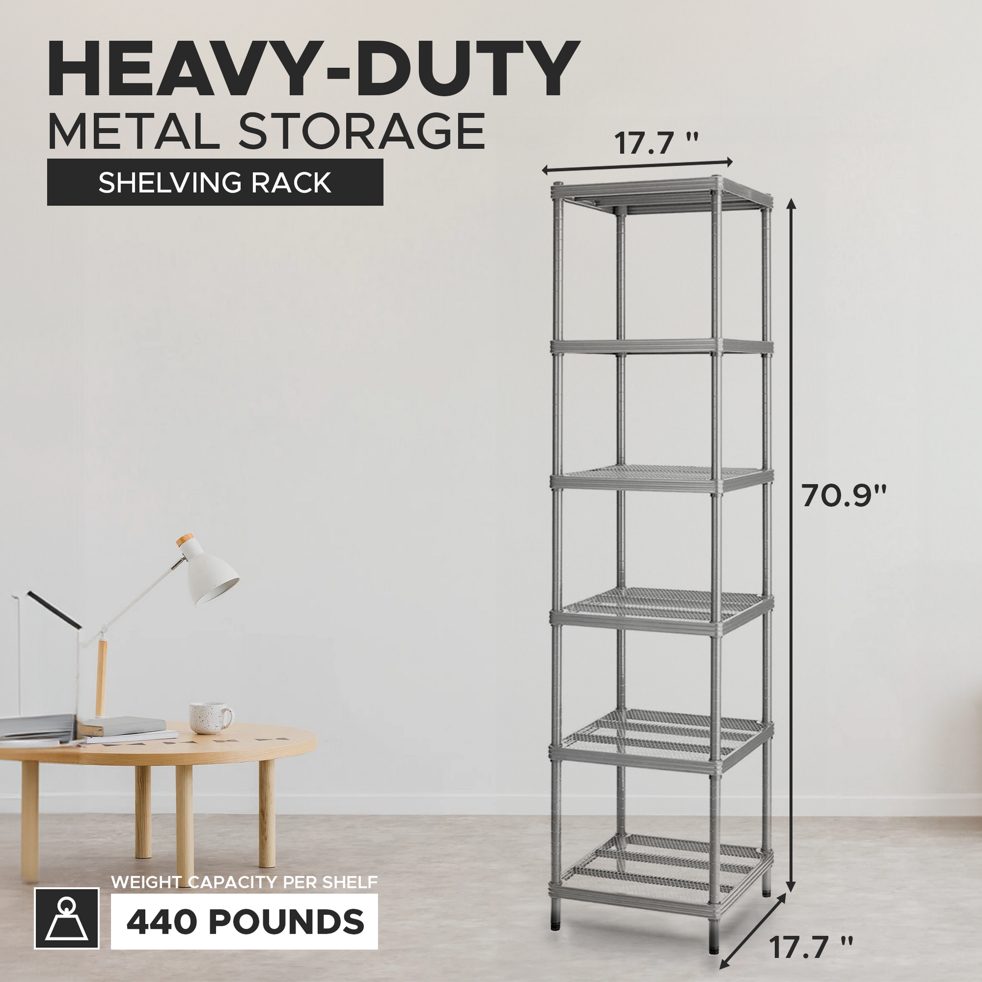 - Weight capacity: 440 pounds per shelf
