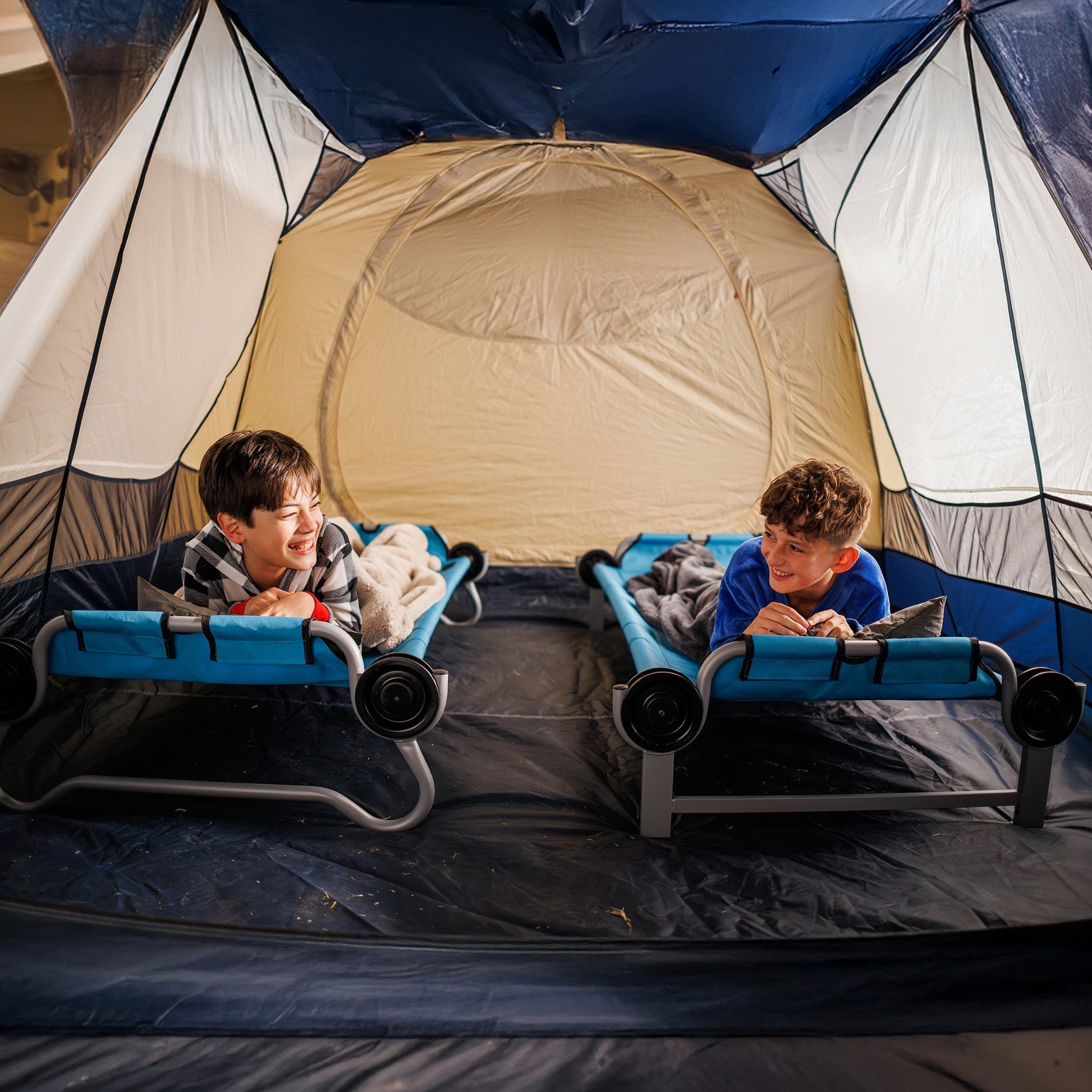 The Disc-O-Bed Youth Double Cot Kid-O-Bunk is the perfect solution for kids aged 7-12, providing a comfortable, versatile sleeping arrangement for camping trips, sleepovers, or any adventure. This set includes two sturdy cots, 2 carry bags for effortless transport, a set of stack adapters for flexible configuration, and 2 locking straps for added security. The Kid-O-Bunk has a weight limit of 200 lbs per cot, ensuring safe and reliable support for your little ones as they sleep soundly.