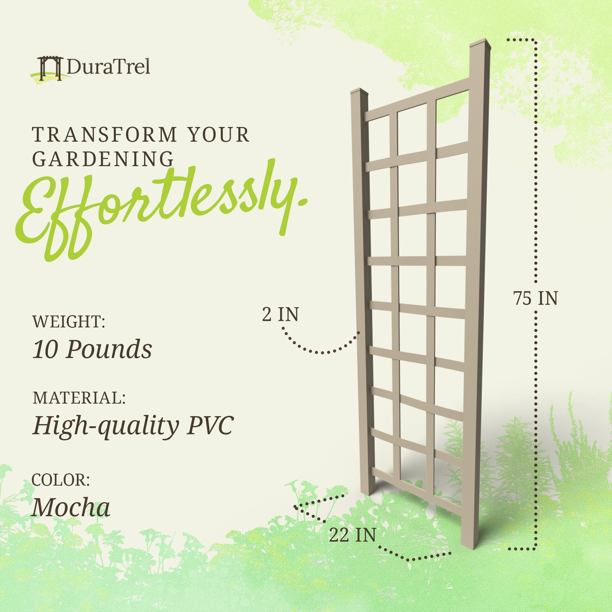 Dura-Trel Elmwood 22 by 75 Inch Indoor Outdoor Garden Trellis w/Ground Anchors, Plant Support for Vines, Climbing Plants, Flowers, & Vegetables, Mocha
