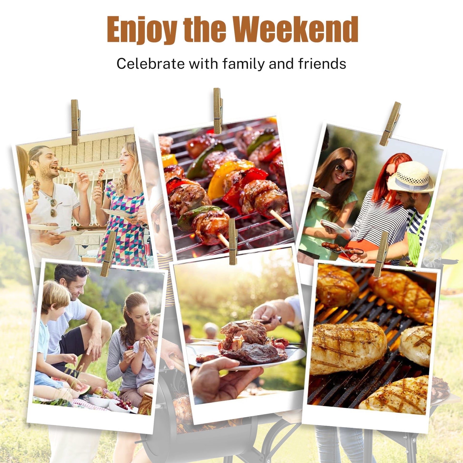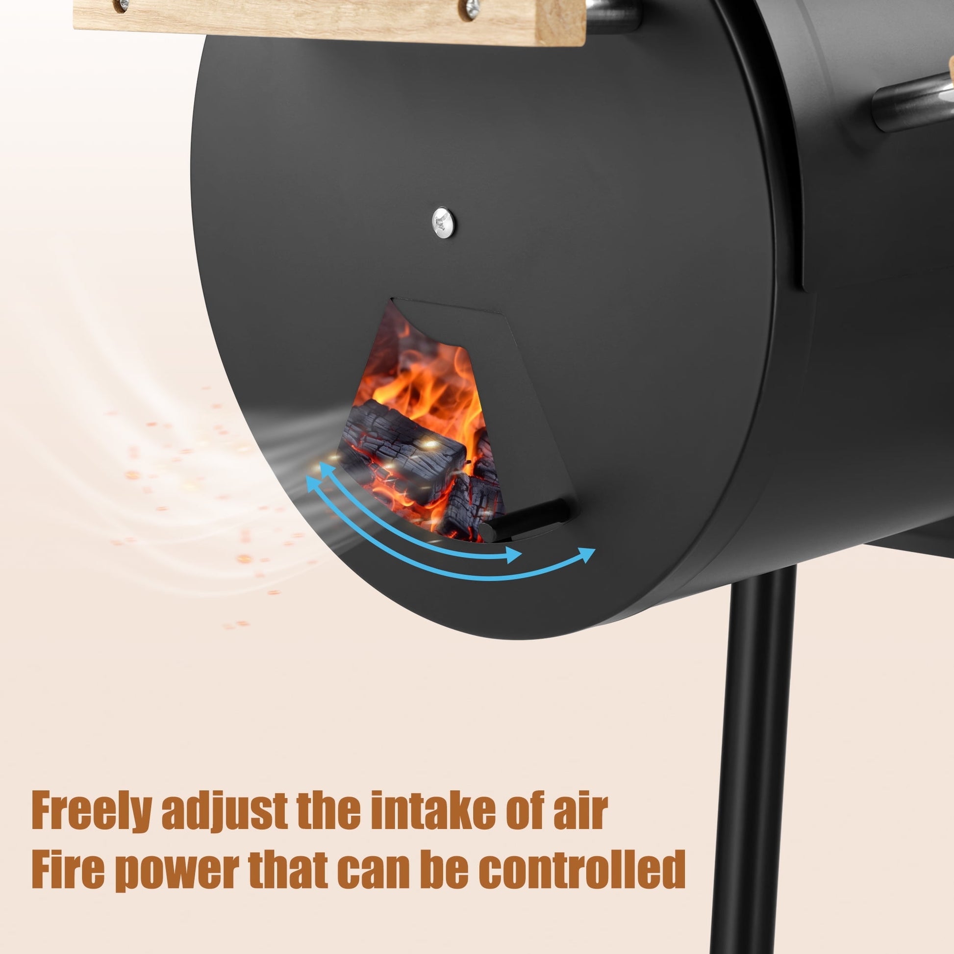 Equipped with a large area of wooden shelf, you can put various barbecue tools, spices, seasonings on it; the bottom has 2 wheels, diameter 5.9" / 15cm, to help you easily move the grill.
