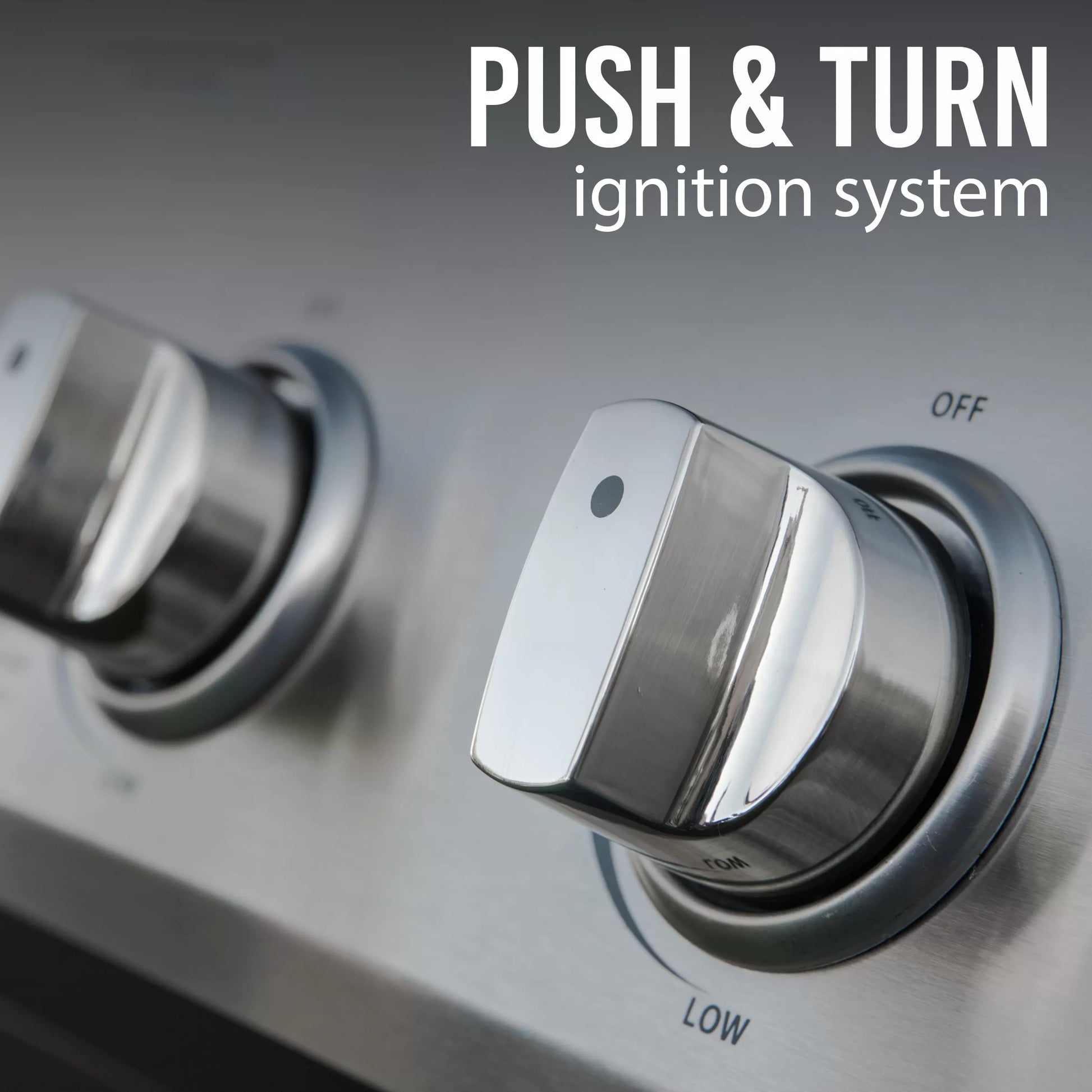 - A push and turn ignition system means you can light all your burners with the simple push of a button.