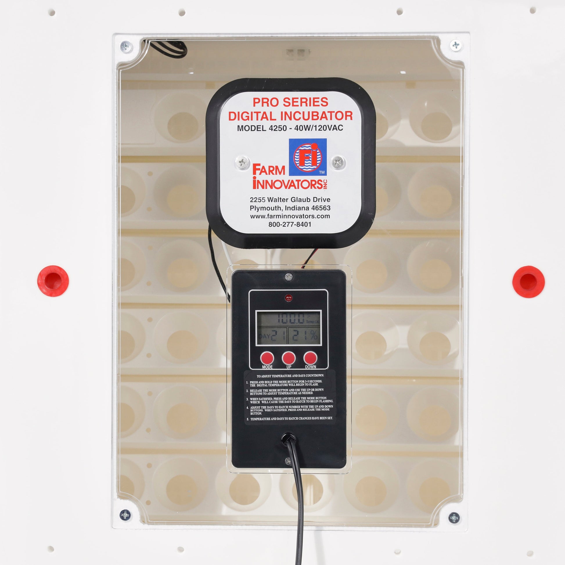 - Digital display shows temperature, humidity, and days to hatch; high/low temperature notification light flashes when outside of range