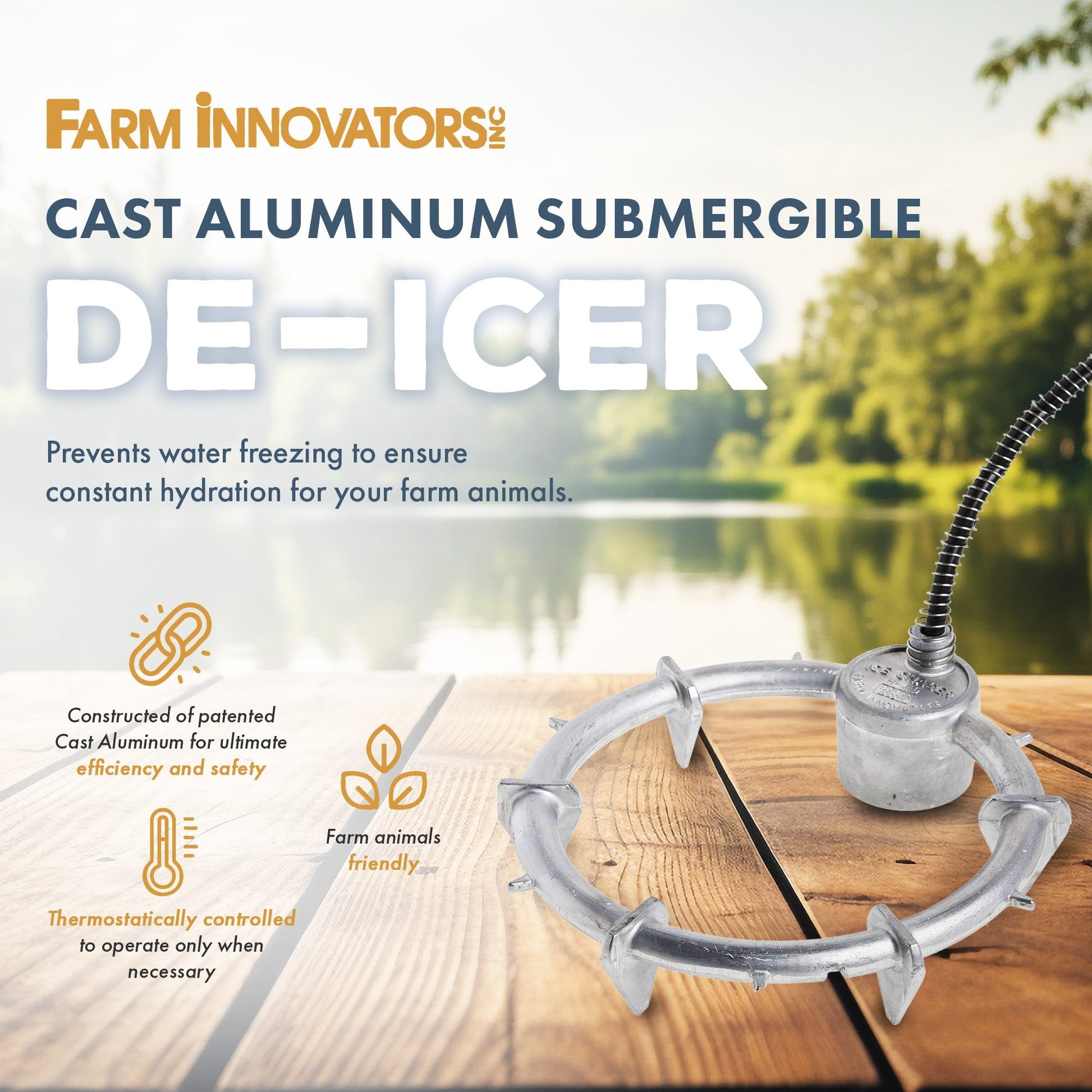 - De-icer submerges beneath the water in your livestock tanks around the farm and home