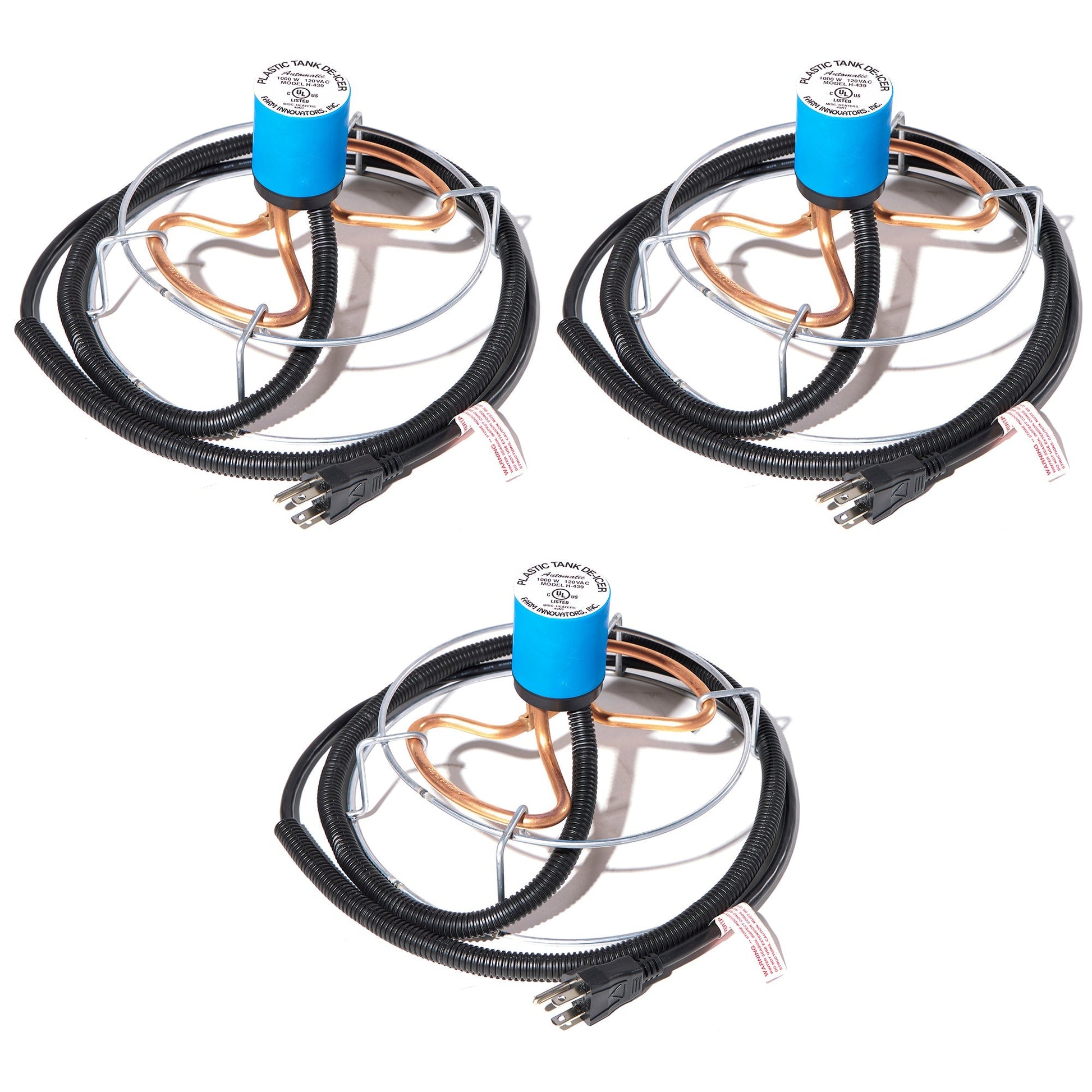 - Pack of 3 water deicers designed to rest at the bottom of watering tanks used around the farm and home