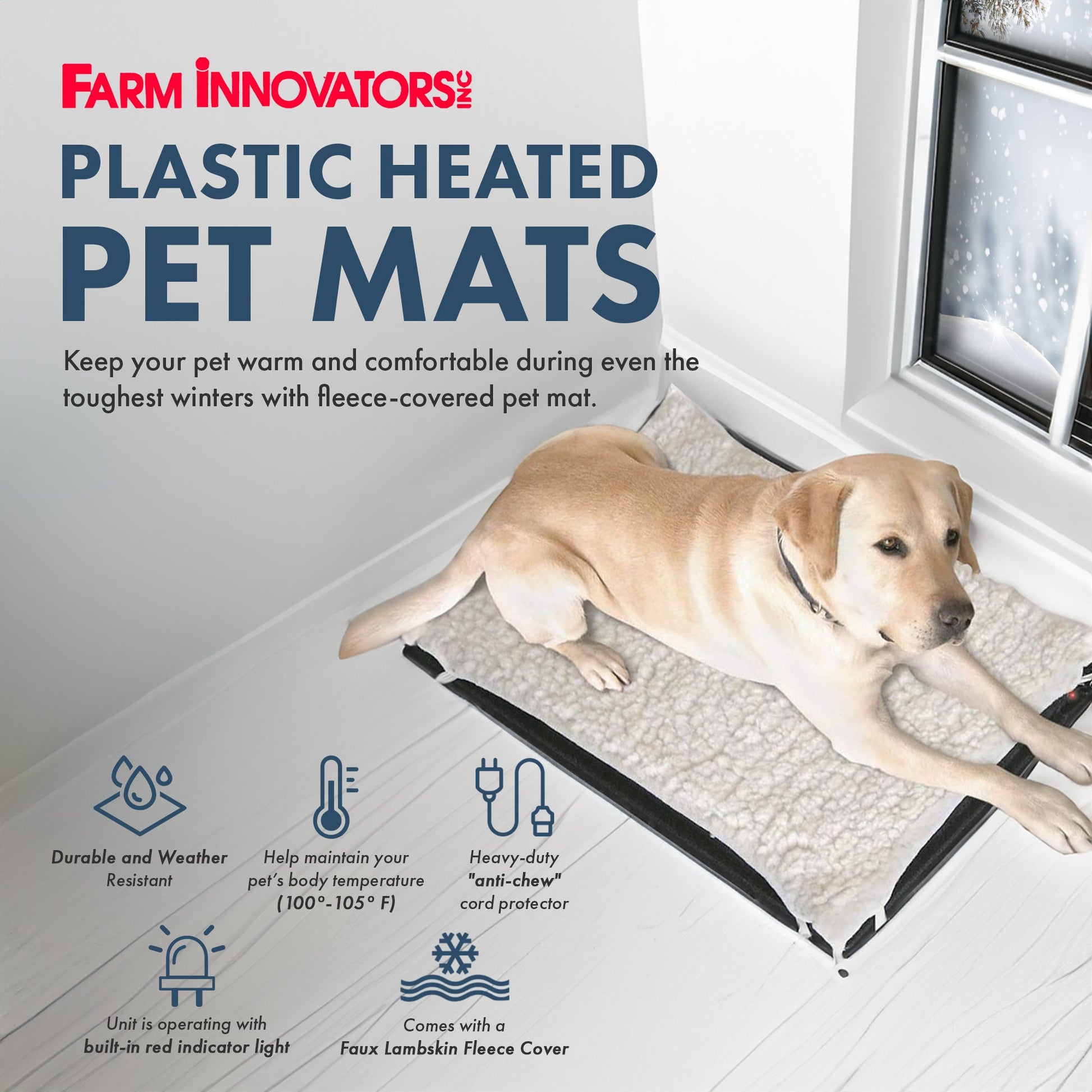 Keep your pet warm and comfortable during even the toughest winters with the Farm Innovators Large Plastic Heated Pet Mat. This 24 x 29-inch fleece-covered pet mat can be used indoors or outdoors and is the ideal winter accessory for your dog, cat, or other pets!