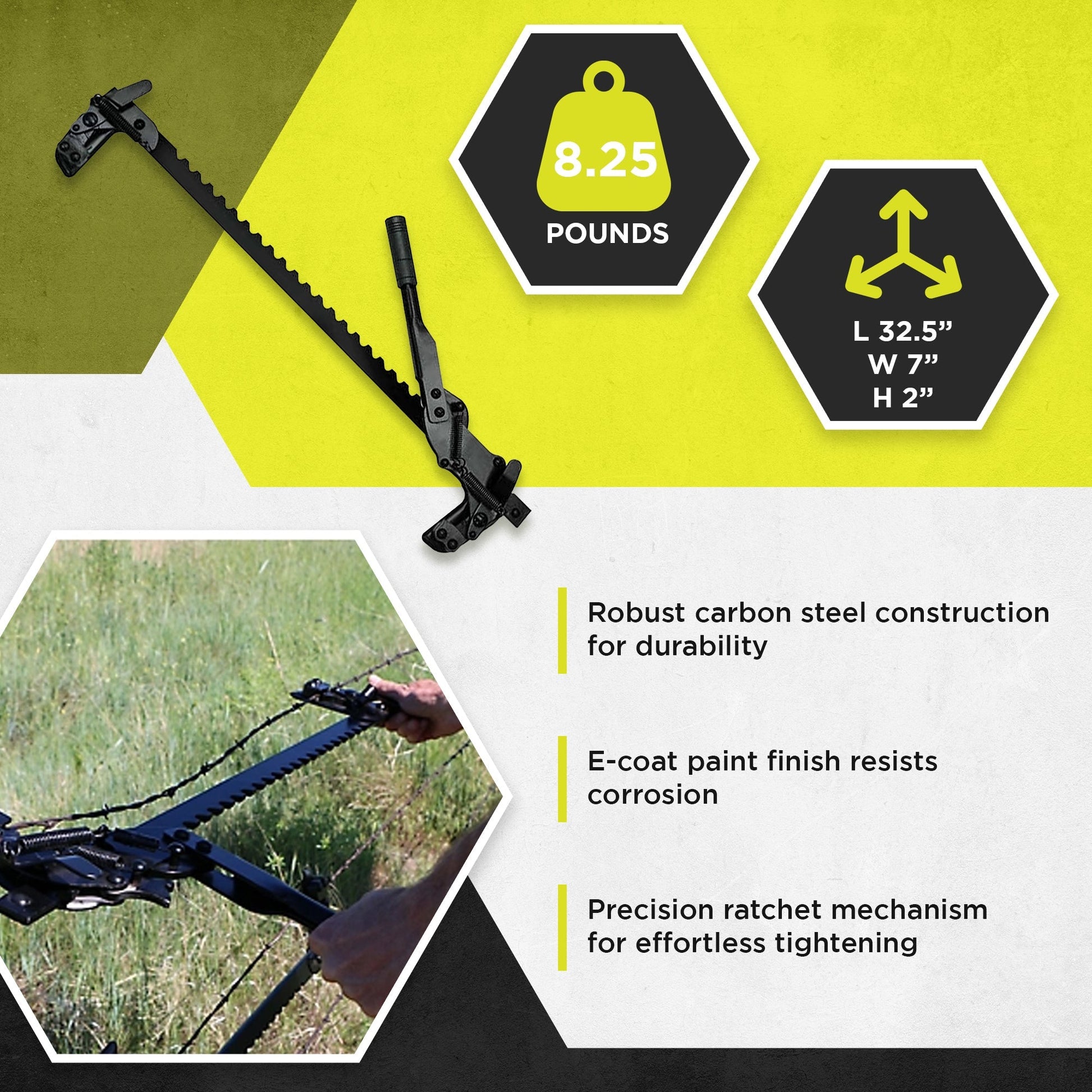 - Fence stretcher features a ratchet action mechanism that simplifies the wire tightening process, ensuring easy adjustments for high tensile, barbed, or smooth wire