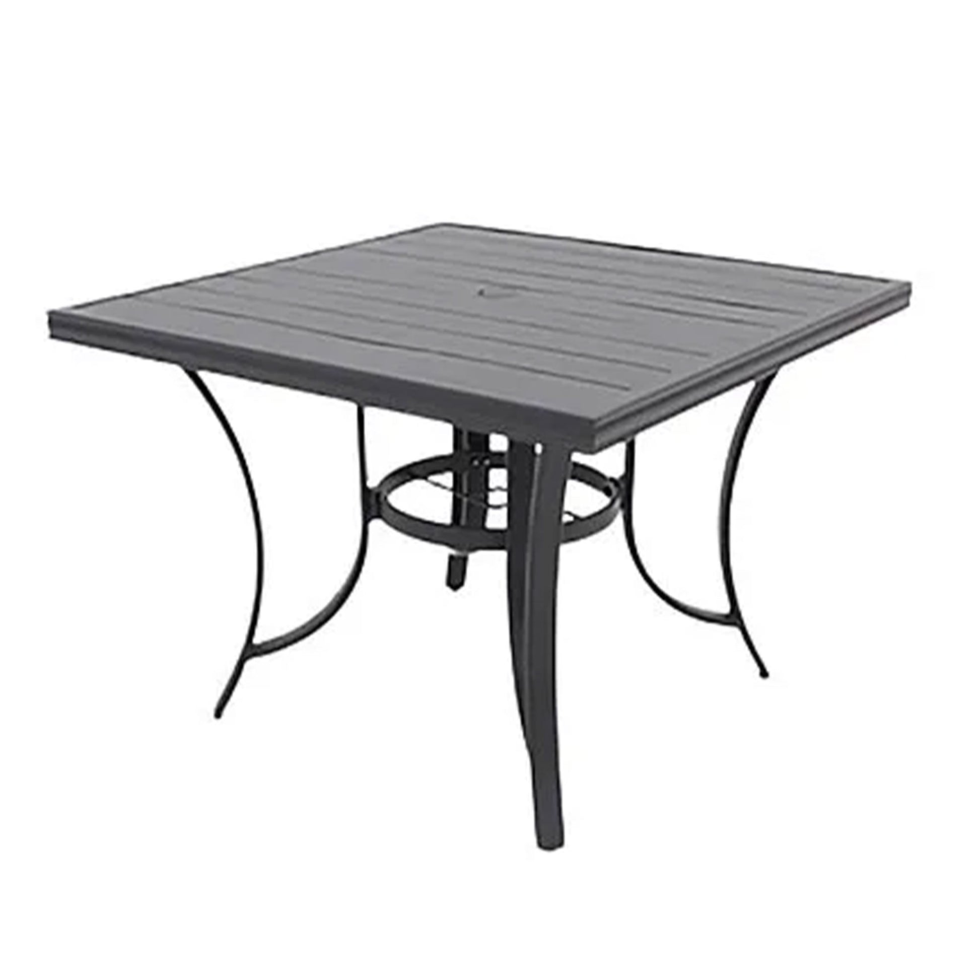 The 40-inch square slat top provides ample space for dining and entertainment and the versatile umbrella hole allows you to choose the immaculate fit for your space. The classic style and neutral color palette make integrating this square table into any outdoor decor scheme easy. Whether you're hosting a casual family meal or a festive gathering with friends, this cafe-style table is ideal for both style and functionality. Pair it with the matching C-spring dining chair, swivel rocker, round slatted table, or Bistro set, all sold separately. This allows you to customize your outdoor space to your exact specifications. Additionally, adding the 9-inch market umbrella and base provides an excellent finishing touch for a complete outdoor dining experience (sold separately).