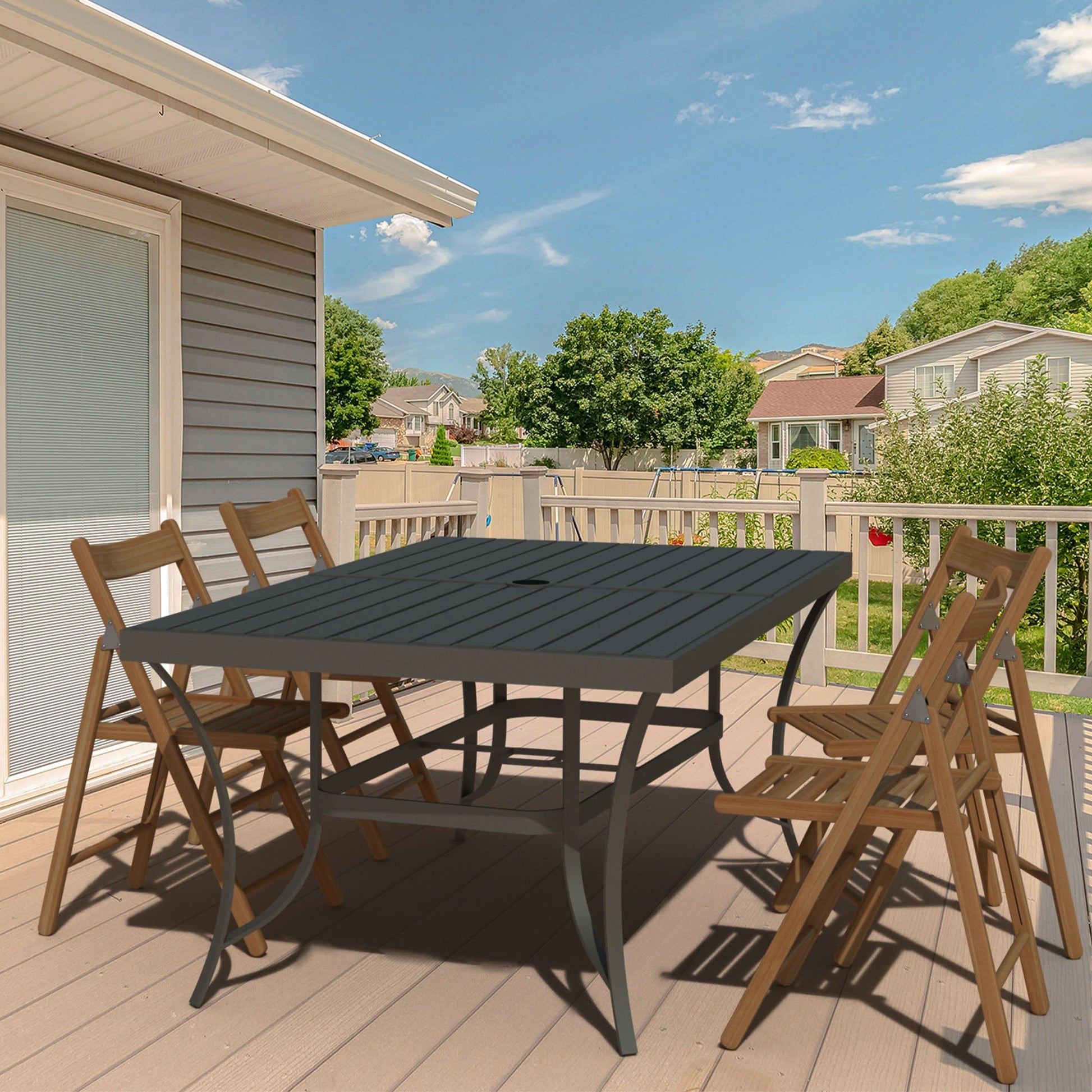 The table's frame, constructed with rust-free powder-coated aluminum in a sophisticated dark gray finish, is a testament to its longevity. This adds a touch of modernity to your outdoor setting and ensures that the table withstands the test of time, maintaining its allure through changing seasons.
