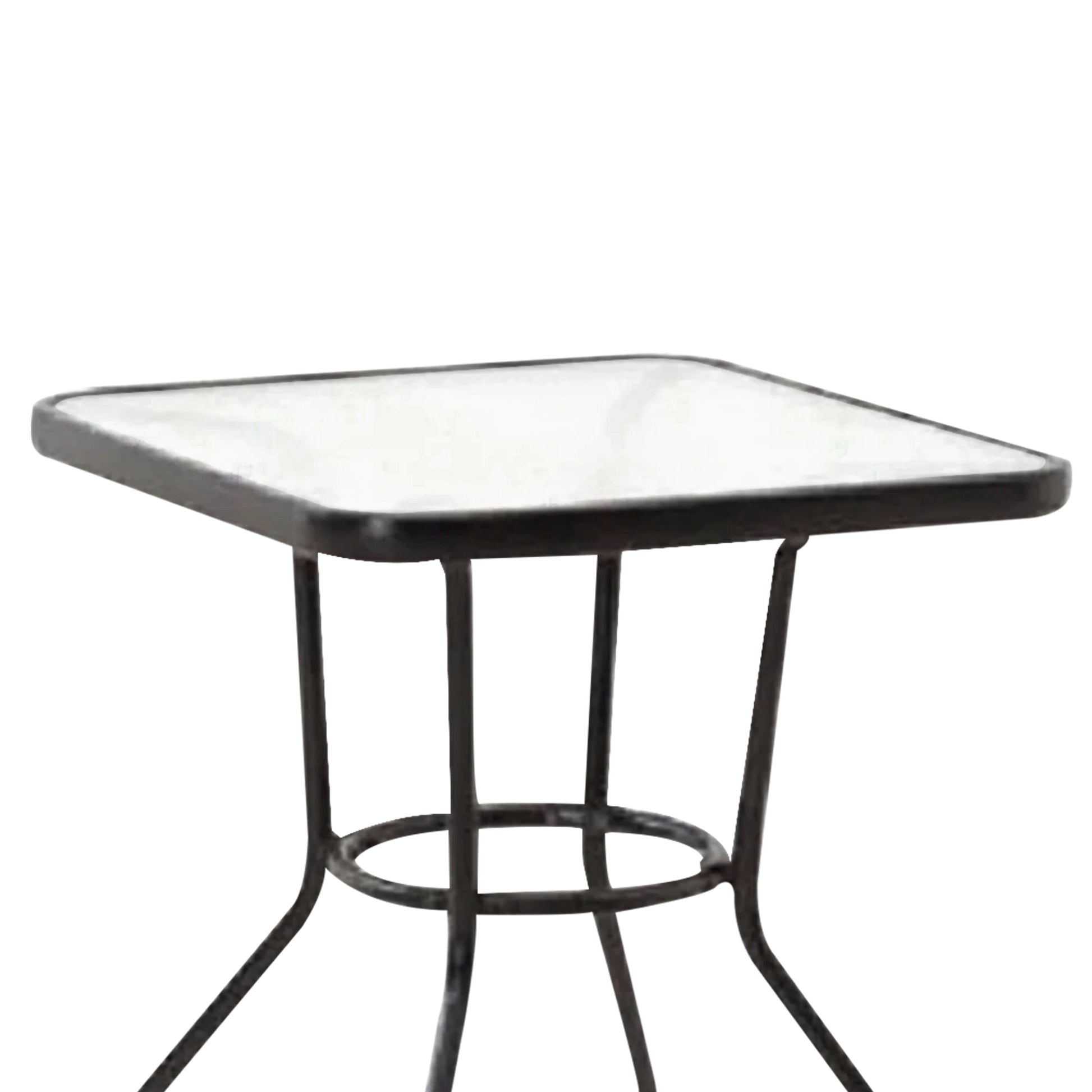 Crafted with a resistant to rust powder-coated black steel frame, this table offers versatility and longevity, making it the ideal centerpiece for any outdoor gathering. The 27-inch square glass top provides ample space for dining and entertainment. You can trust in the quality and reliability of this table for years to come.