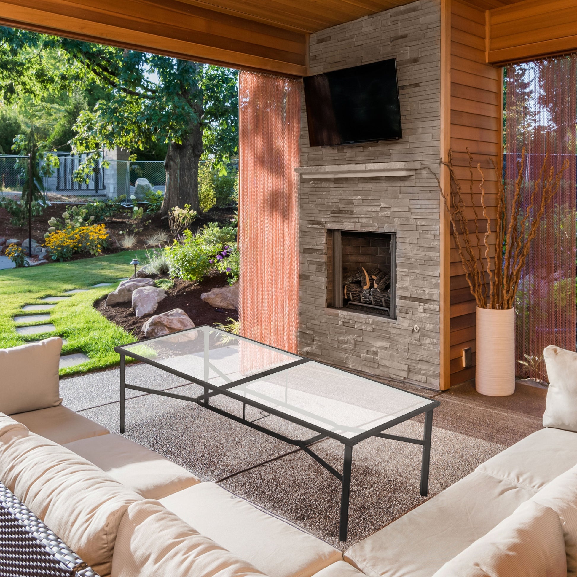 This expansive dining table boasts an impressive rectangular tempered glass top measuring a spacious 80 by 40 inches, offering abundant room for delightful meals and memorable gatherings. Crafted with a rust-free powder-coated steel frame, this piece ensures versatility and longevity, making it a reliable companion for indoor and outdoor settings. Designed with weatherproof materials, this patio table stands against the elements, promising year-round enjoyment with minimal maintenance. The premium black finish enhances its overall aesthetic appeal, while the sturdy tabletop provides a secure and reliable surface for various activities.