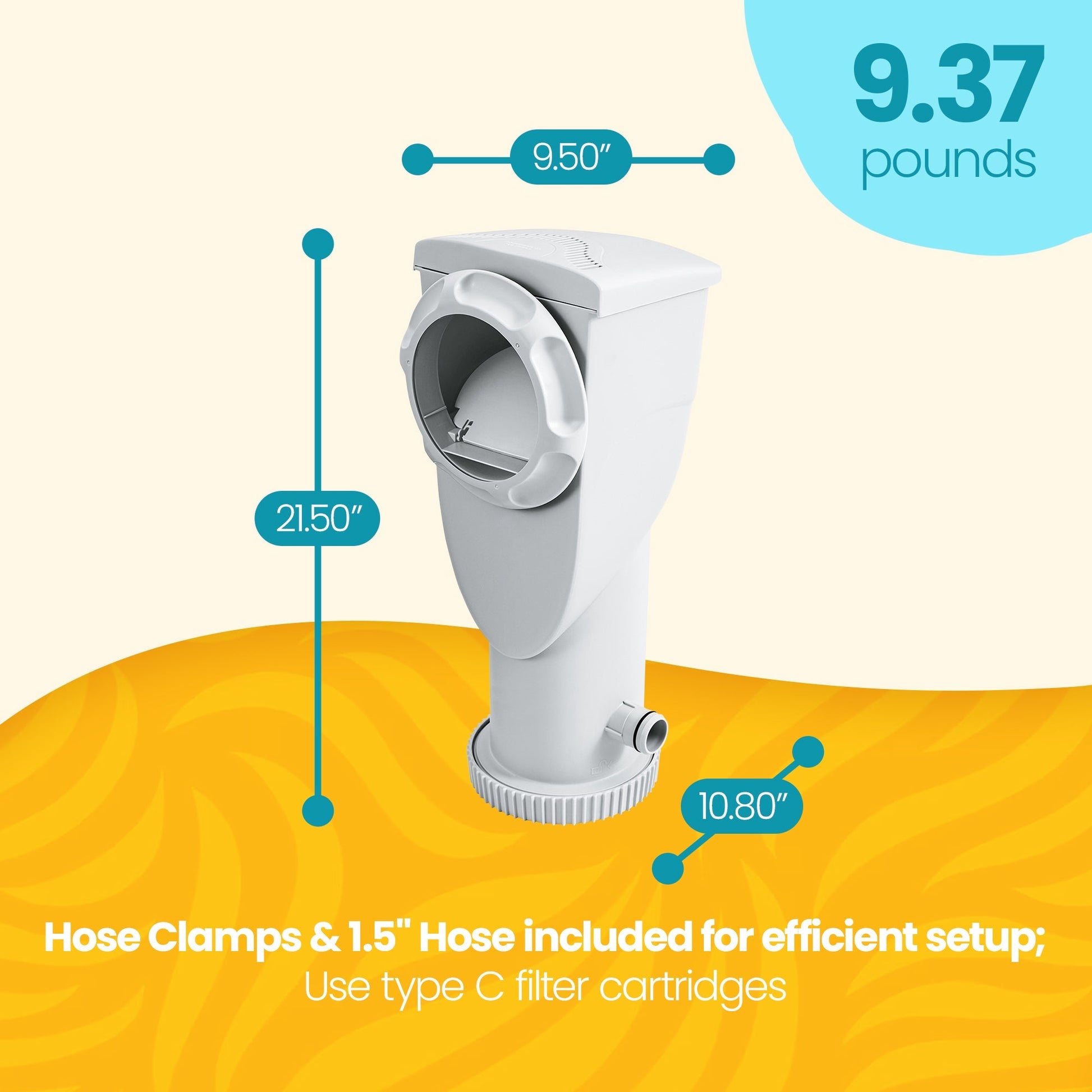 - Includes hose clamps and (1) 1.5-inch hose for efficient setup; Use type C filter cartridges