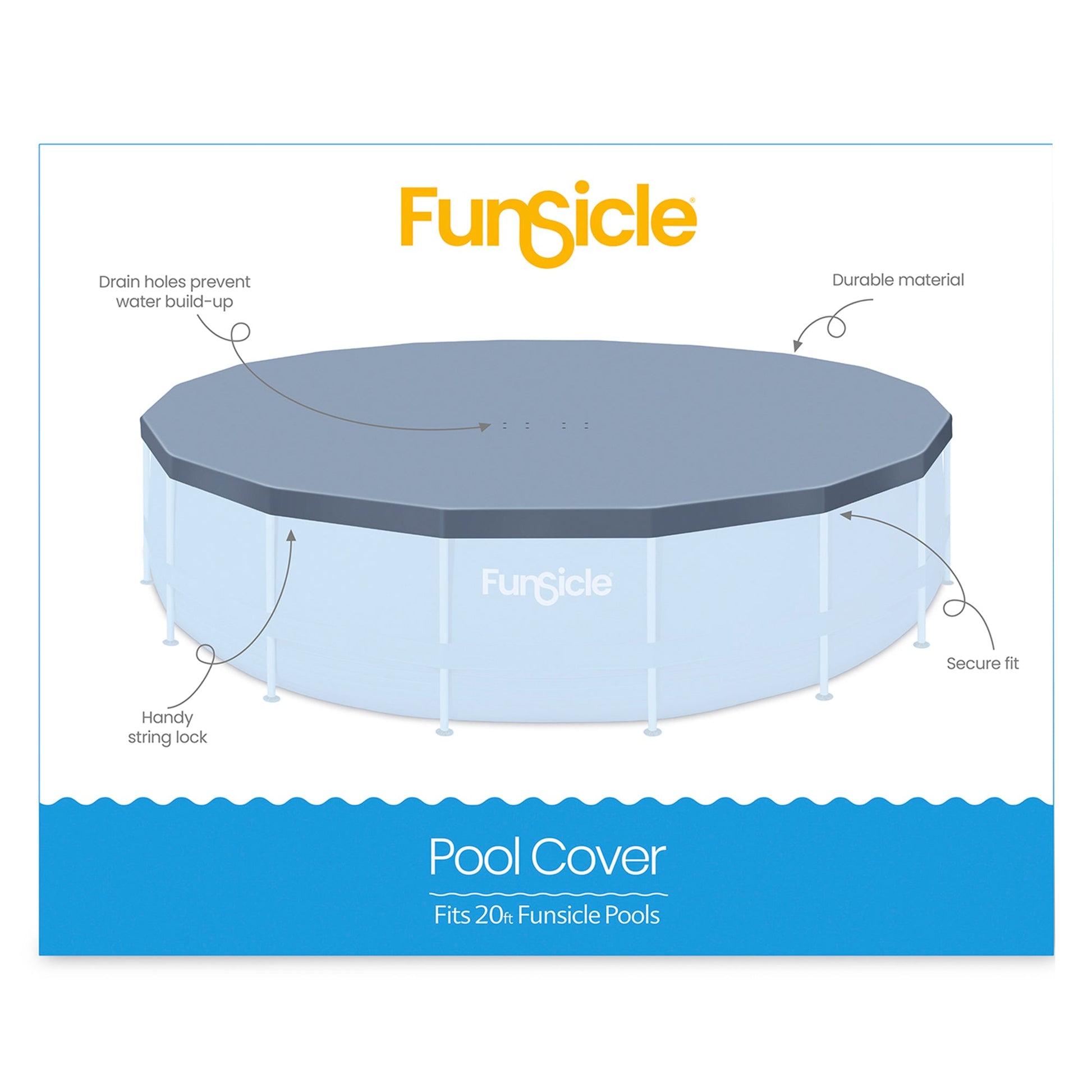 This above-ground pool accessory is the key to maintaining clean and clear water all season, suitable for 20-foot above-ground pools including Funsicle Oasis and Activity pools. Made from durable materials, this outdoor pool cover makes sure to keep leaves, insects, and other debris out of your family pool so you can rest easy during the off-season or on the days your pool is not in use. Featuring an adjustable string lock, setup is quick and easy. Simply spread the cover over the pool water, press the string lock, and pull the drawstring to tighten and secure it. This feature keeps the cover snugly in place, making sure to keep any outside debris from entering your backyard pool. Drainage holes are included to keep water from building up, ensuring your cover and your pool frame maintain stable.