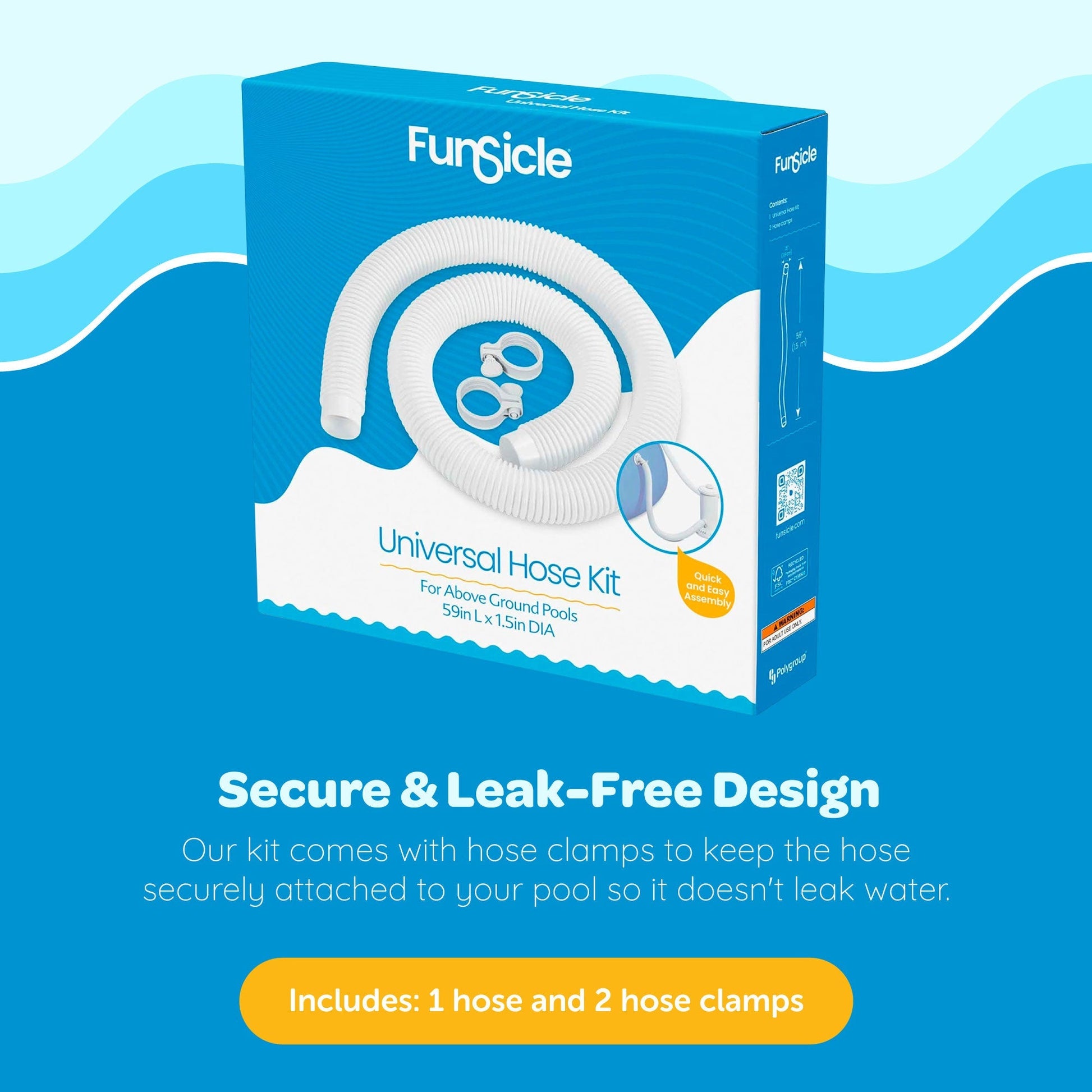 The universal pool-pump hose kit includes 2 hoses and 4 clamps with easy-to-use tightening screws that secure the hose to your pump and backyard pool, providing you with peace of mind while you splash and play. The pool-pump hoses measure 59 inches long and have a 1.5-inch diameter, offering a versatile fit for most above-ground pools. Our universal hose kit is compatible with all Funsicle above-ground swimming pools and can also be used for most pools that have a 1.5-inch-diameter hose. The pool pump replacement parts are Funsicle part #P56000017.