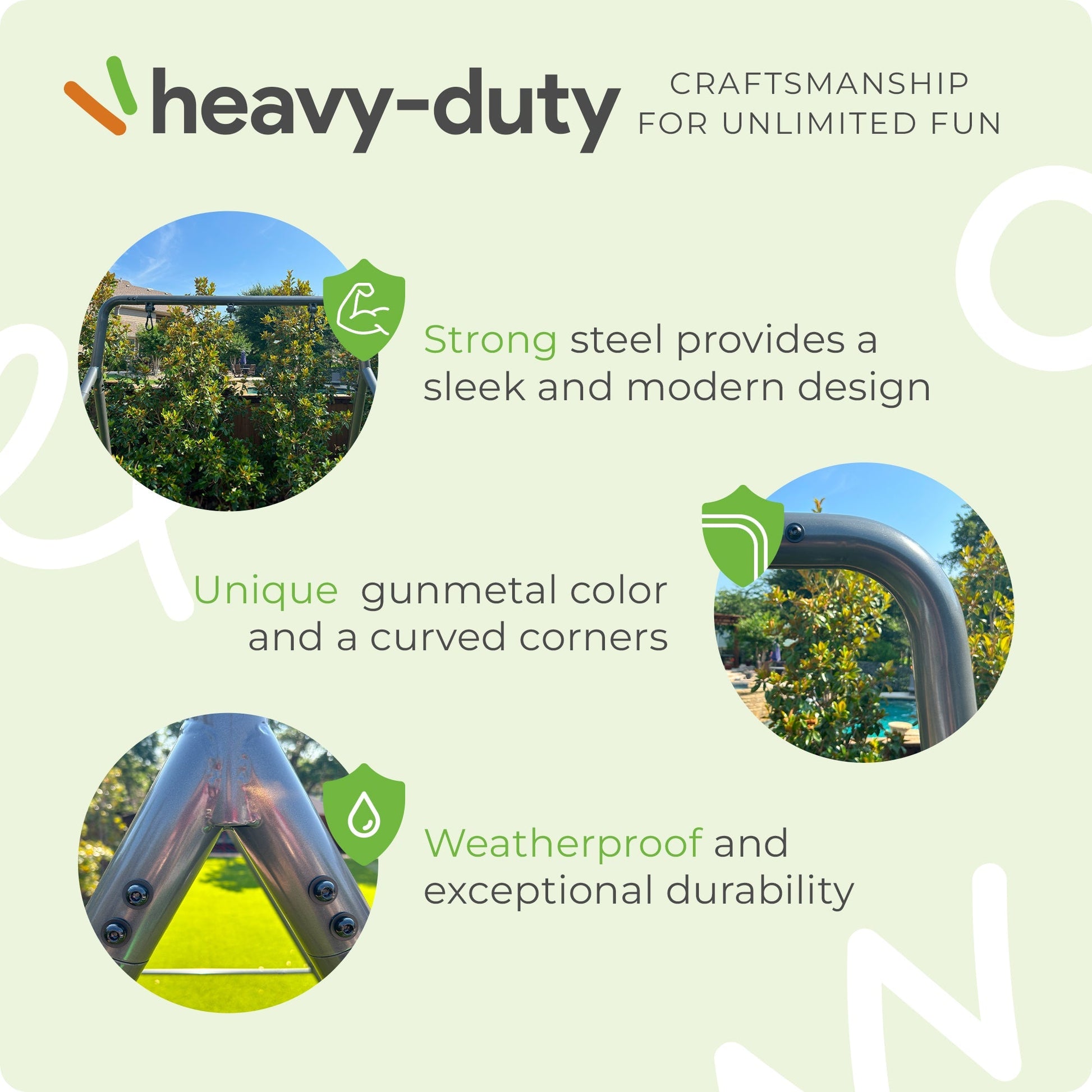 With a sleek and modern design, this swing set is sturdy and built for fun. Curved corners and a unique gunmetal color seamlessly blend with landscaping and upgrade the visual appeal of your outdoor space. Designed to exceed your expectations, this single swing frame delivers fun while ensuring it offers quality, versatility, and aesthetics. Guaranteed not to bend or warp, its robust design features a support bar and wide frame. It provides optimal stability and strength for hours of secure and enjoyable swinging.