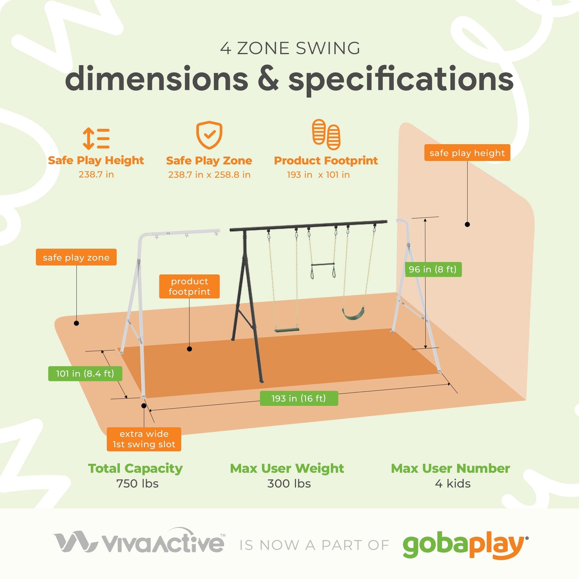 - Enjoy a swing set with a footprint of nearly 15 feet (4.9 meters) in length and 8.4 feet in depth (2.5 meters), providing ample room for endless fun for kids aged 3 to 10
