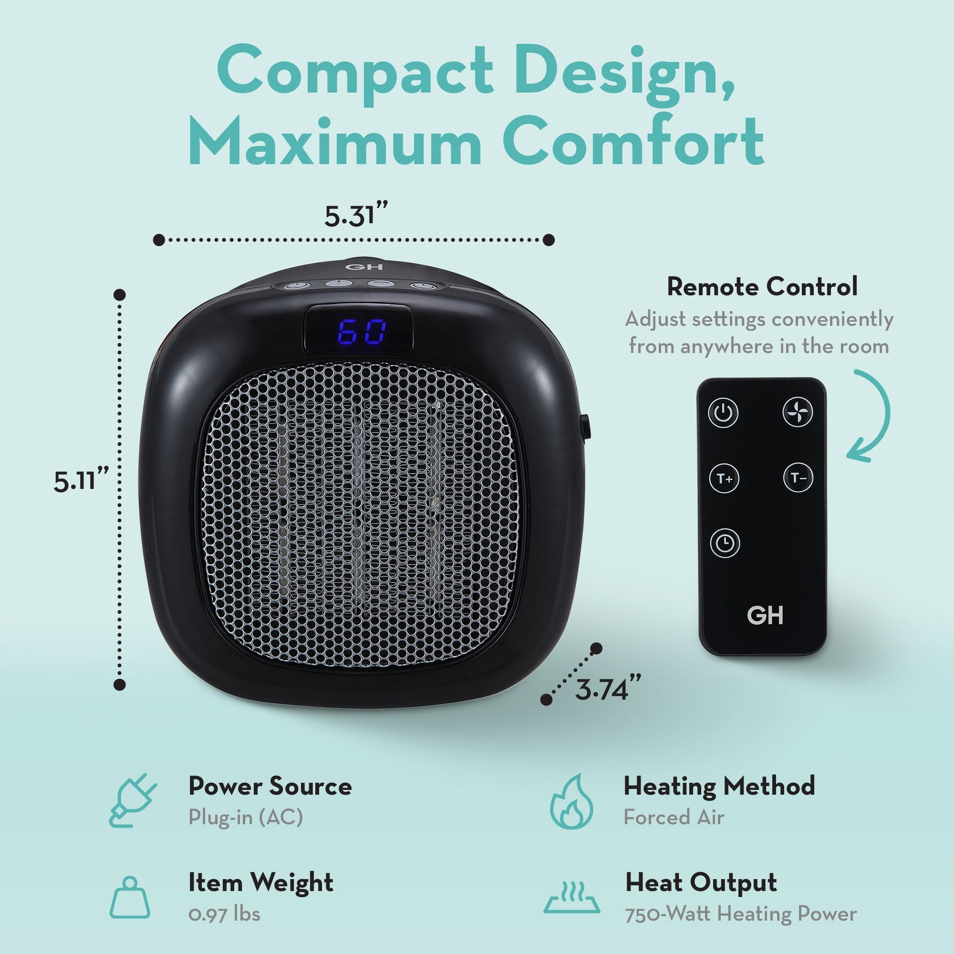 Take command of your comfort with its convenient remote, digital display, adjustable thermostat, and 2 heat settings. Tailor your heating experience to suit your needs with a 12-hour timer that allows for precise control in 1-hour increments, ensuring warmth is always available when you need it. Enjoy the ease of adjusting the temperature to create the perfect environment. Keep peace of mind with its safety overheat protection, power safety button, and cool touch housing. Additionally, the 60-second cool-down feature ensures safe operation, preventing overheating and enhancing the unit's longevity. Built for ease of use, the electric heater simply plugs into a wall outlet. With its small footprint and lightweight design, you can easily move this mini heater to any room in your home.