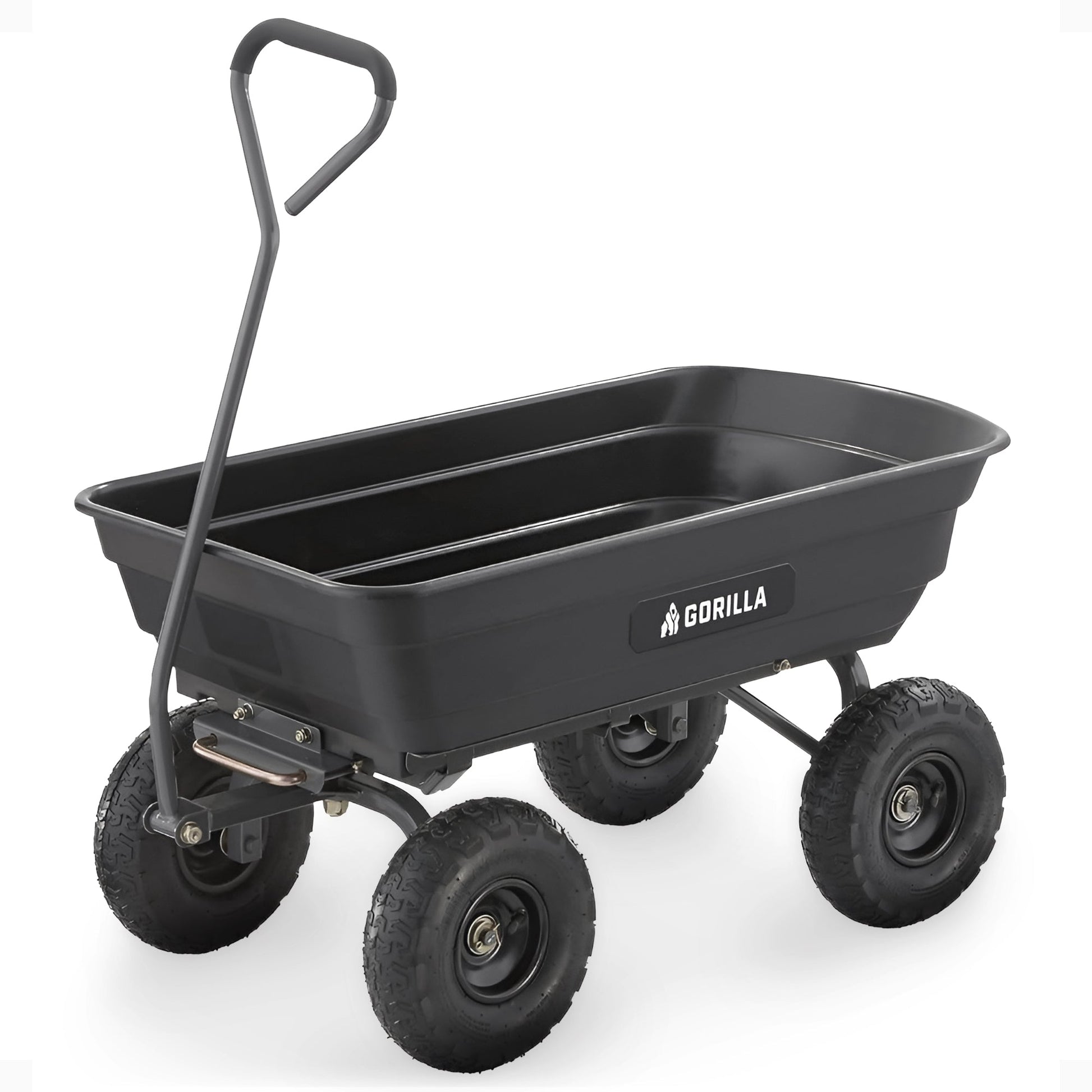 Designed with a bed measuring 36 inches long by 20 inches wide, this utility cart wagon provides durability when carrying heavier equipment or outdoor landscape yard items. The gorilla wagon features 10-inch pneumatic tires that ensure usability and smooth maneuvering on many different terrains, while the balanced 4-wheel stability makes it able to tackle heavy landscaping projects or garden projects. With a 600-pound capacity, its easy to tackle heavy project loads whether doing work around the garden, lawn, barn, or farm. The patented quick-release dumping system allows you to easily unload whatever you're hauling and the pull cart handle allows you to maneuver seamlessly with tight-turn steering. The innovative steel frame design of the wheelbarrow cart allows for quick and easy assembly.