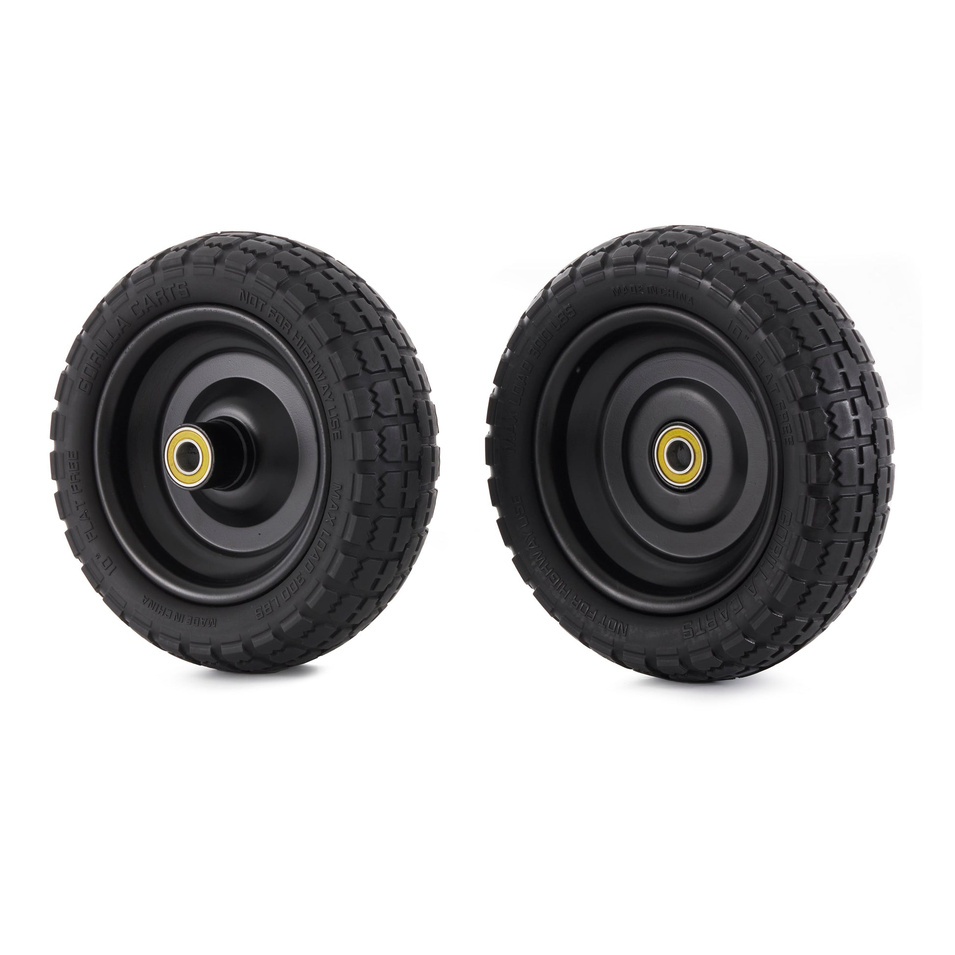 - Versatile, 10-inch, no-flat set of 2 replacement tires for lawn carts, garden carts, hand trucks, air compressors, pressure washers, and more