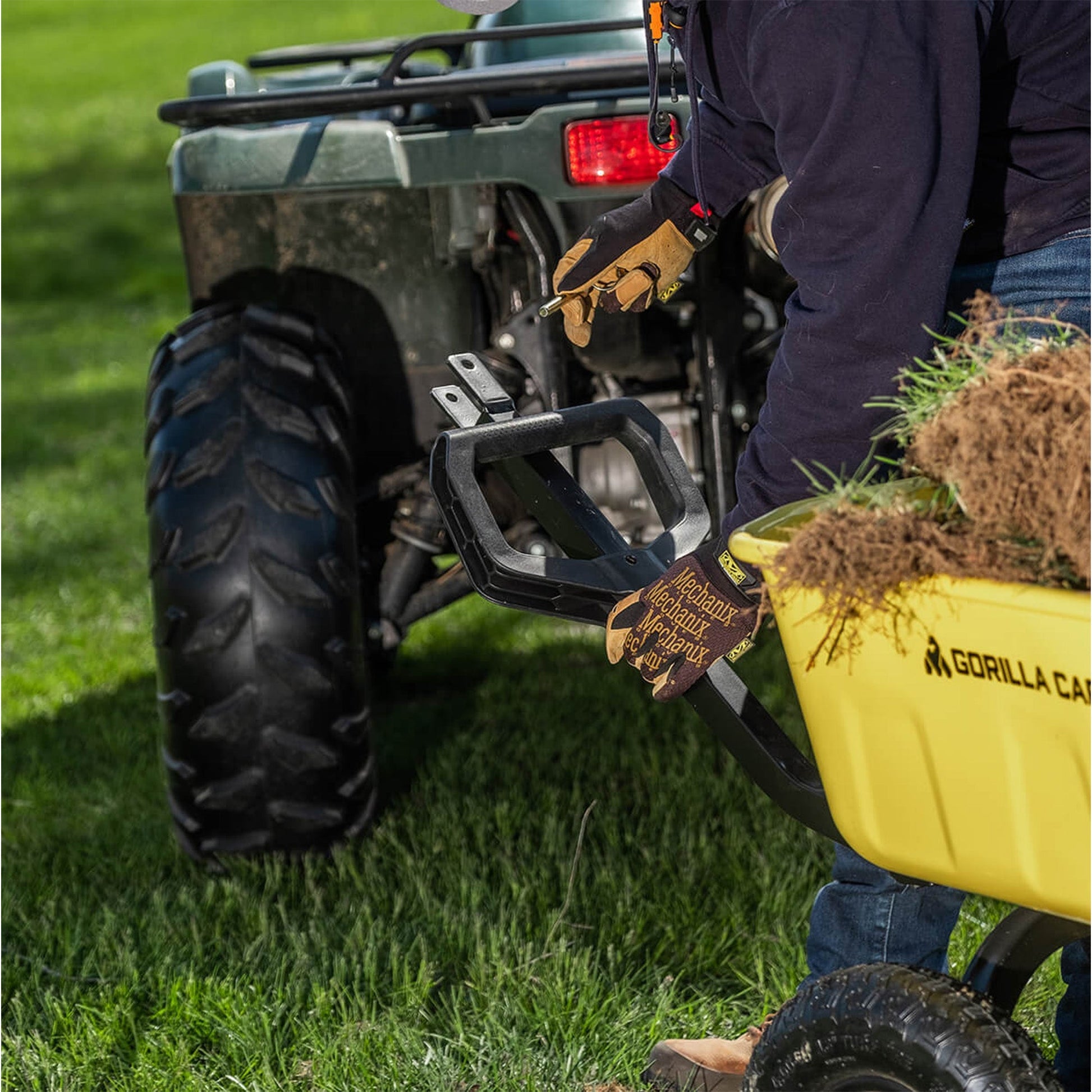 Designed with a huge bed measuring 39 inches long by 28 inches wide, this utility cart wagon provides durability when carrying heavier equipment or outdoor landscape yard items. The gorilla wagon features 13-inch pneumatic tires that ensure usability and smooth maneuvering on many different terrains, while the 1,200-pound capacity makes it easy to tackle heavy project loads whether doing work around the garden, lawn, barn, or farm. The patented quick-release dumping system of this cart with wheels allows you to easily unload whatever you're hauling and the 2-in-1 pull cart handle allows you to maneuver seamlessly with tight-turn steering. Plus, you can easily convert the yard wagon handle to a hitch for towing behind a lawn mower tractor or ATV if needed.