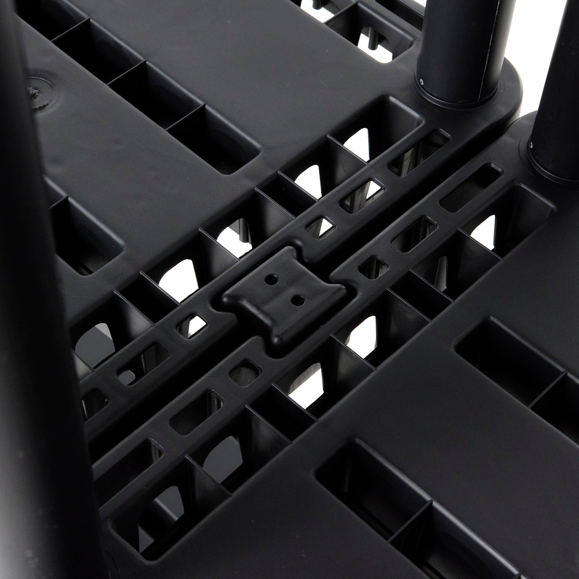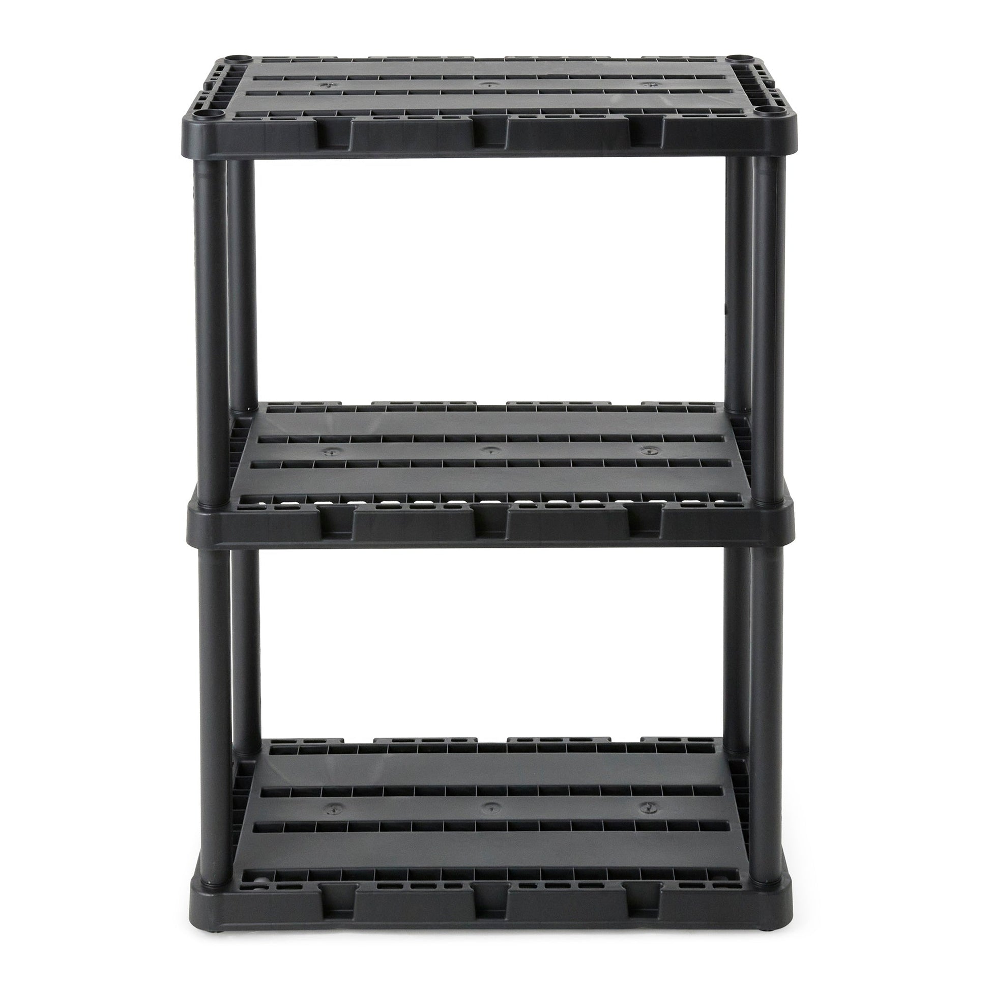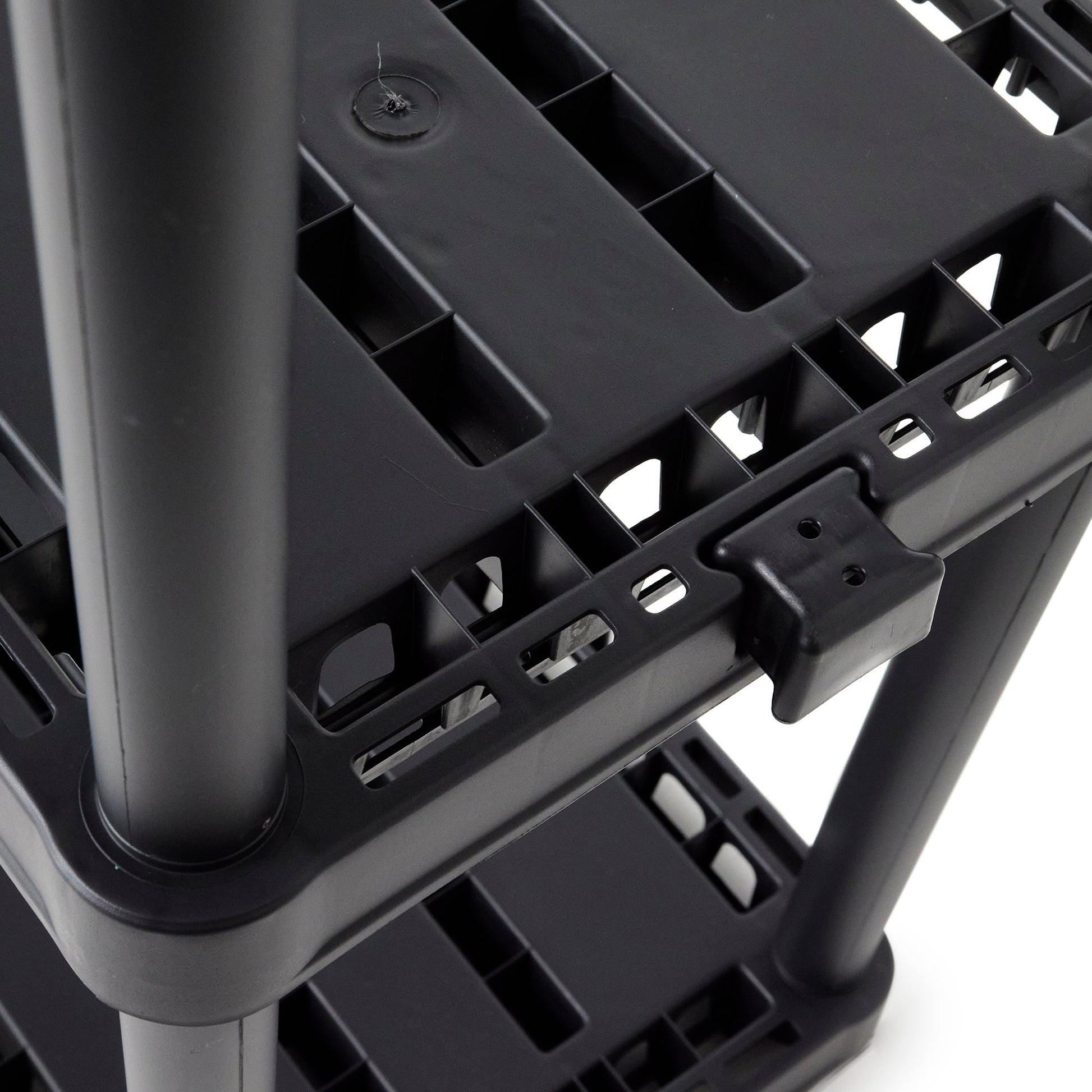 With its simple, no-tool setup, lightweight body, and black coloring, you can easily make this storage unit work in any room of the house. Easily snap all the included parts of this multi-purpose unit together for a simple, no-stress installation process. Plus, with the Knect-A-Shelf feature, you can interconnect multiple units from any side for added storage space (additional units sold separately). Constructed of durable and lightweight materials, the storage possibilities are endless. Each shelf is solid and made to support up to 55 pounds and up to 165 pounds overall, allowing you to organize seasonal clothing items, home decor, toys, supply crafts, and other tools or accessories. Make sure that you distribute the weight evenly on the fixed shelves. This organizing shelf offers an ideal height for both kids and adults and is a great addition to any home or office space.