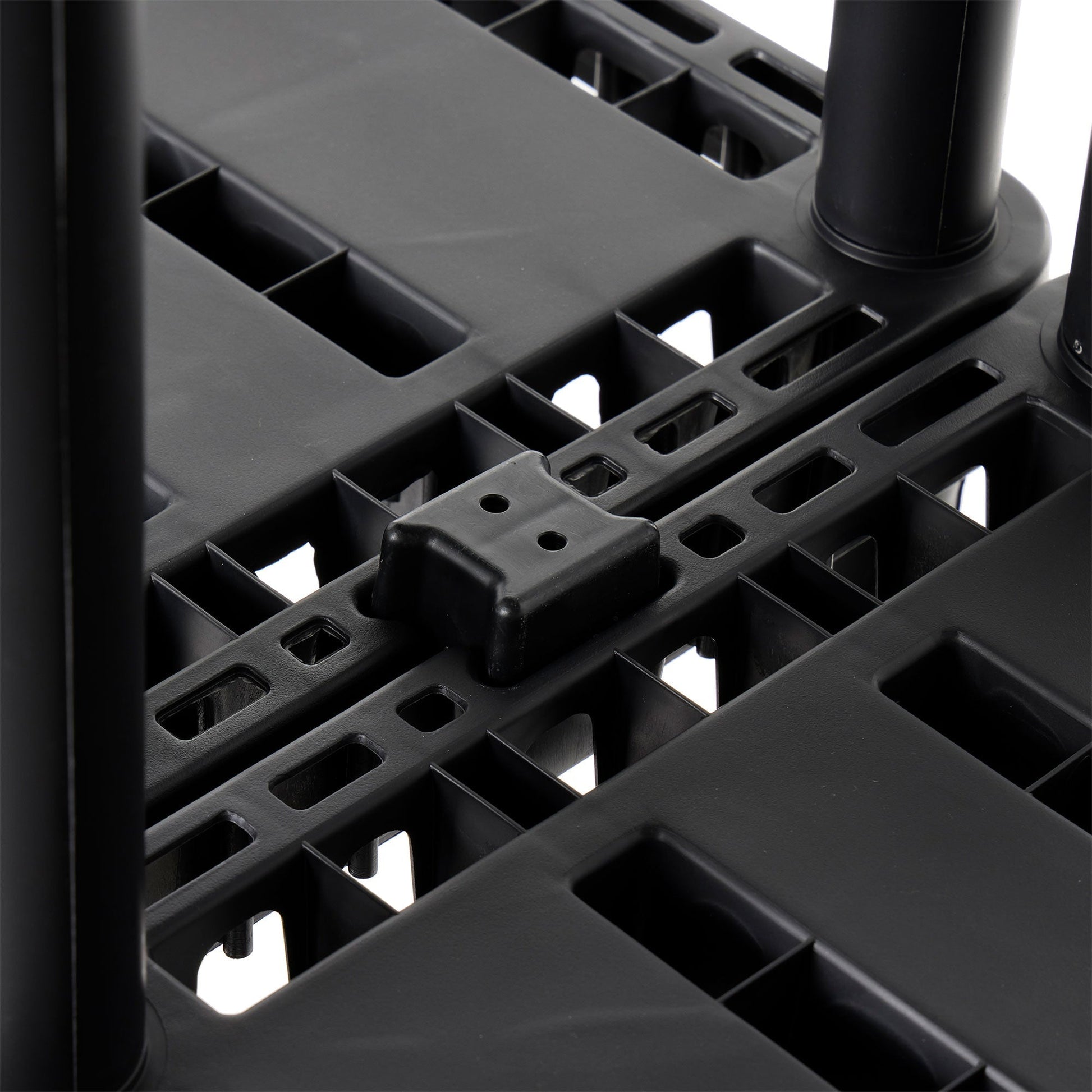 With its simple, no-tool setup, lightweight body, and black coloring, you can easily make this storage unit work in any room of the house. Easily snap all the included parts of this multi-purpose unit together for a simple, no-stress installation process. Plus, with the Knect-A-Shelf feature, you can interconnect multiple units from any side for added storage space (additional units sold separately). Constructed of durable and lightweight materials, the storage possibilities are endless. Each shelf is ventilated and made to support up to 55 pounds and up to 220 pounds overall, allowing you to organize seasonal clothing items, home decor, toys, supply crafts, and other tools or accessories. Make sure that you distribute the weight evenly on the fixed shelves. This organizing shelf offers an ideal height for both kids and adults and is a great addition to any home or office space.