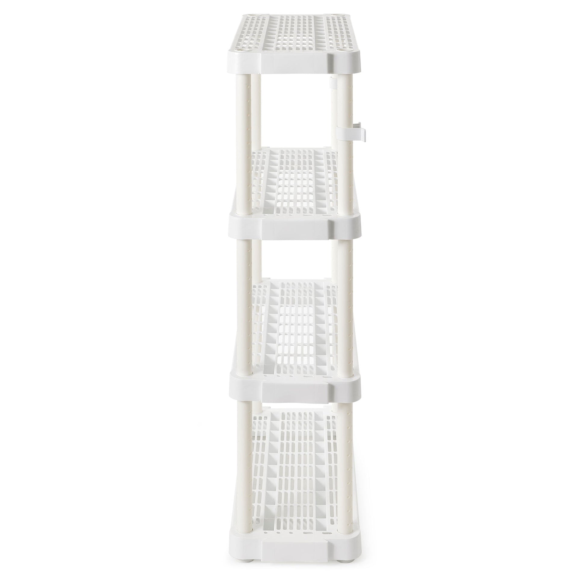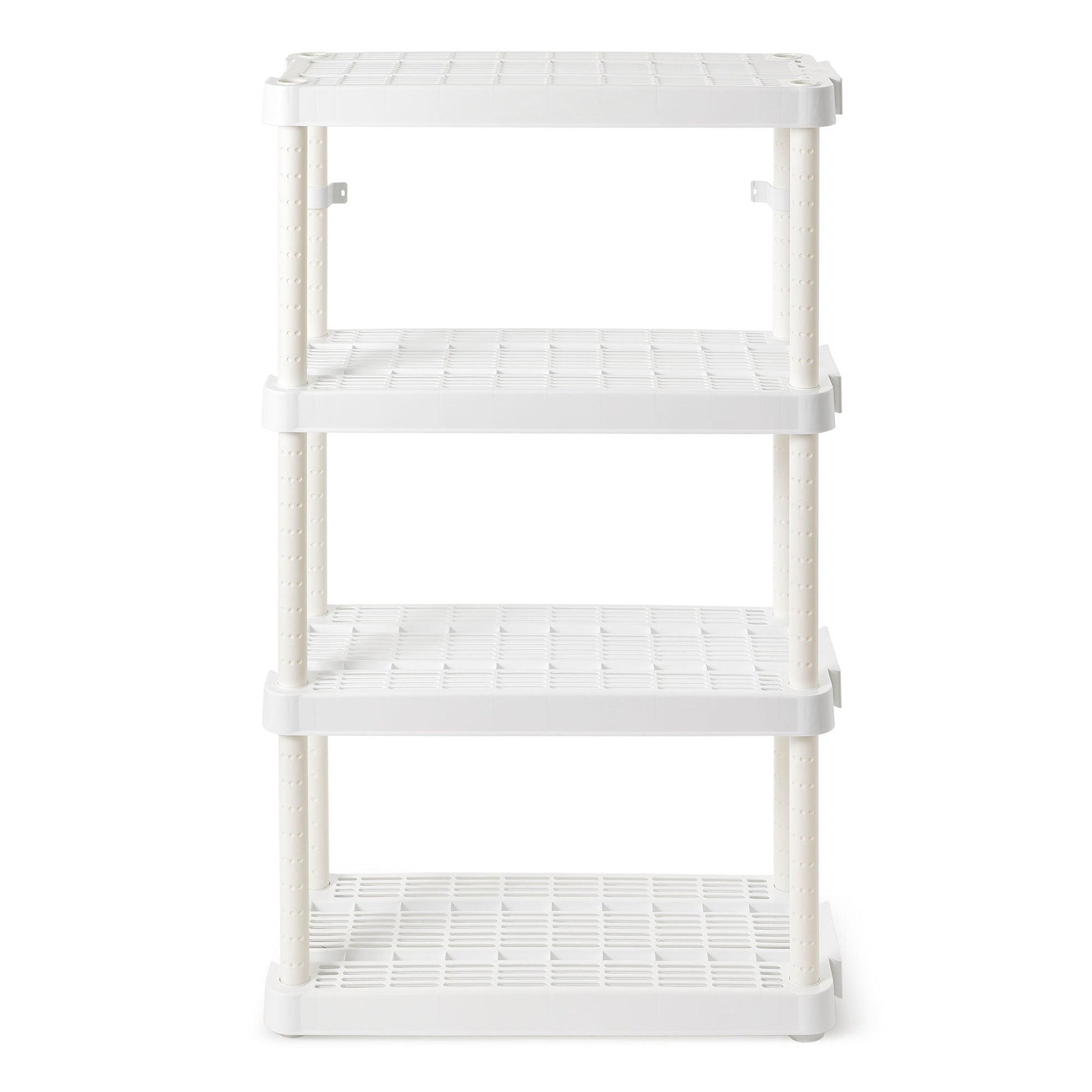 This bathroom storage shelf showcases timeless elegance for functional spaces with its lightweight, plastic construction and sleek color. Easily snap together for a simple installation process, and interconnect with additional units side-by-side for more storage space. Each ventilated shelf supports up to 150 pounds, providing a 600-pound unit capacity overall. Make sure that you distribute the weight evenly on the shelves for optimal, lasting use. With the adjustable 4 shelves, you can organize laundry supplies, seasonal clothing items, home decor, toys, crafts, or tools. Simply use the slide and lock technology to easily adjust the shelves. The closet storage shelf measures 32 inches long, 14 inches wide, and 54.5 inches tall offering a storage solution for any room. For added versatility, you can use the included brackets to mount the plastic shelves to the wall.