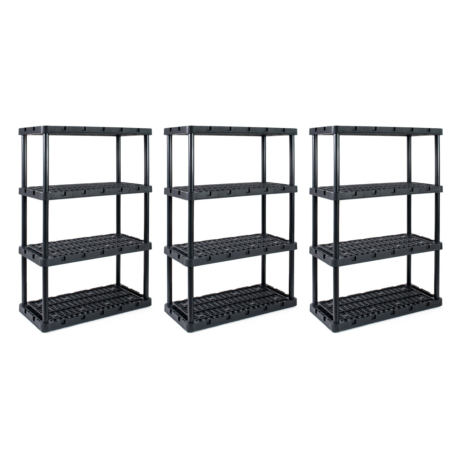 These plastic storage shelves can function as your garage storage or shelf organizer, allowing you to easily organize and store various items. With its simple, no-tool setup, lightweight body, and black coloring, you can easily make this storage unit work in any room of the house. Easily snap all the included parts of this multi-purpose unit together for a simple, no-stress installation process. Plus, with the Knect-A-Shelf feature, you can interconnect multiple units from any side for added storage space (additional units sold separately). Constructed of durable and lightweight materials, the storage possibilities are endless. Each shelf is ventilated and made to support up to 150 pounds and up to 750 pounds overall, allowing you to organize seasonal clothing items, home decor, toys, supply crafts, and other tools or accessories. Make sure that you distribute the weight evenly on the fixed shelves. This organizing shelf offers an ideal height for both kids and adults and is a great addition to any home or office space.